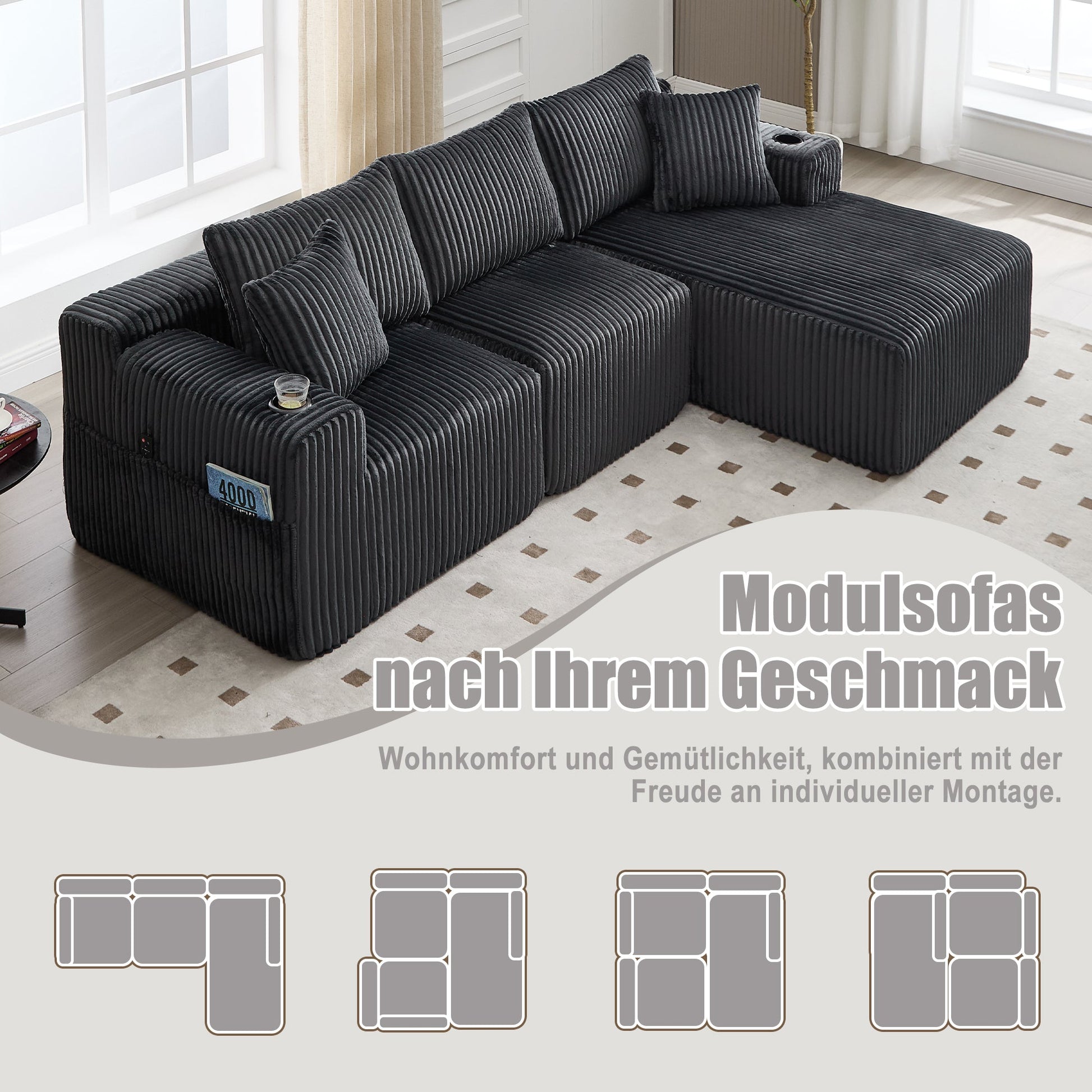 Modular Sofa Set Chaise 2-Seater Side Pockets Corduroy