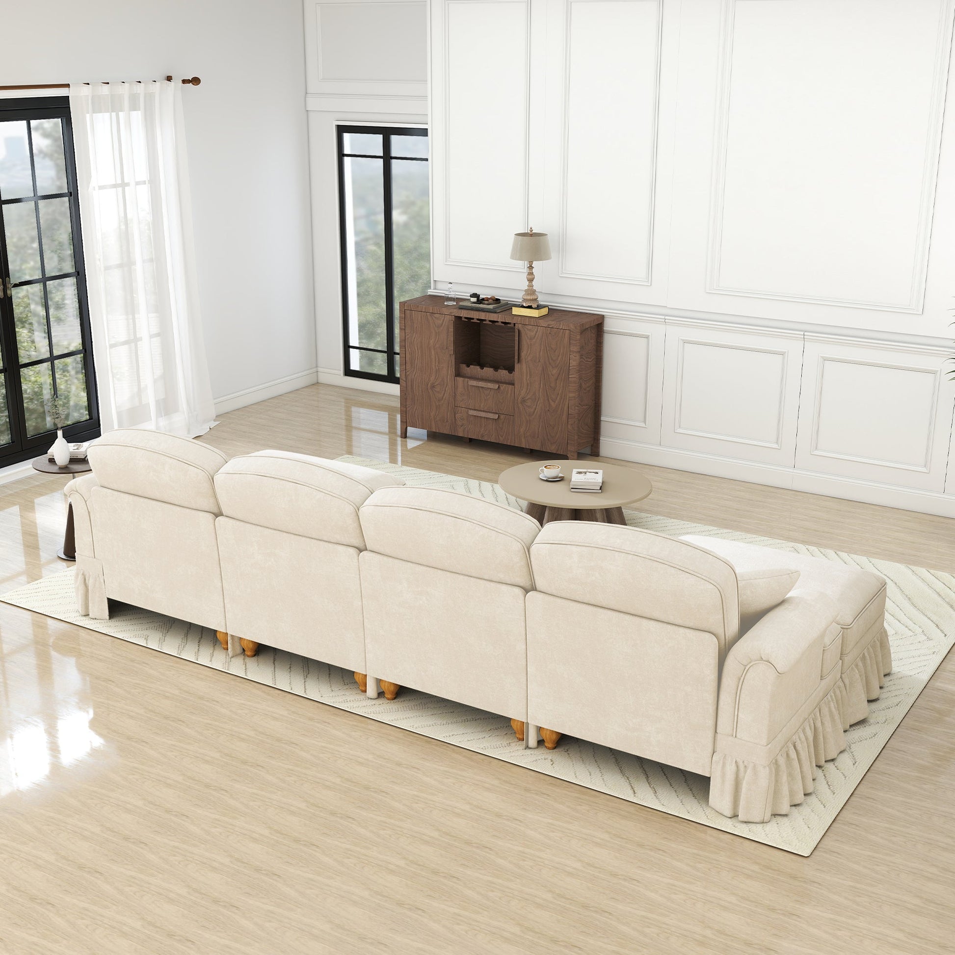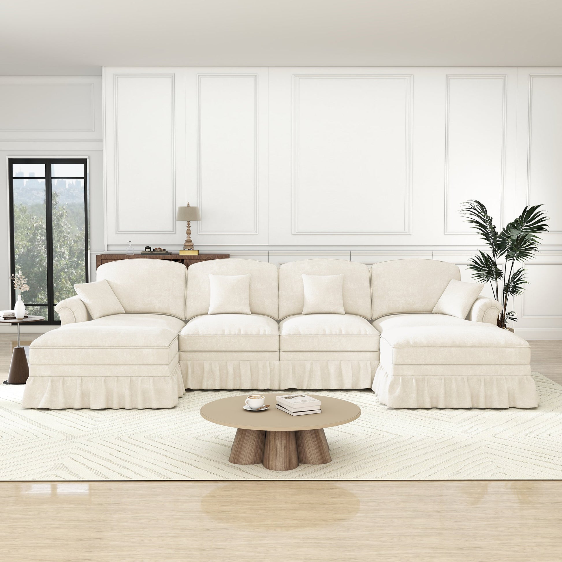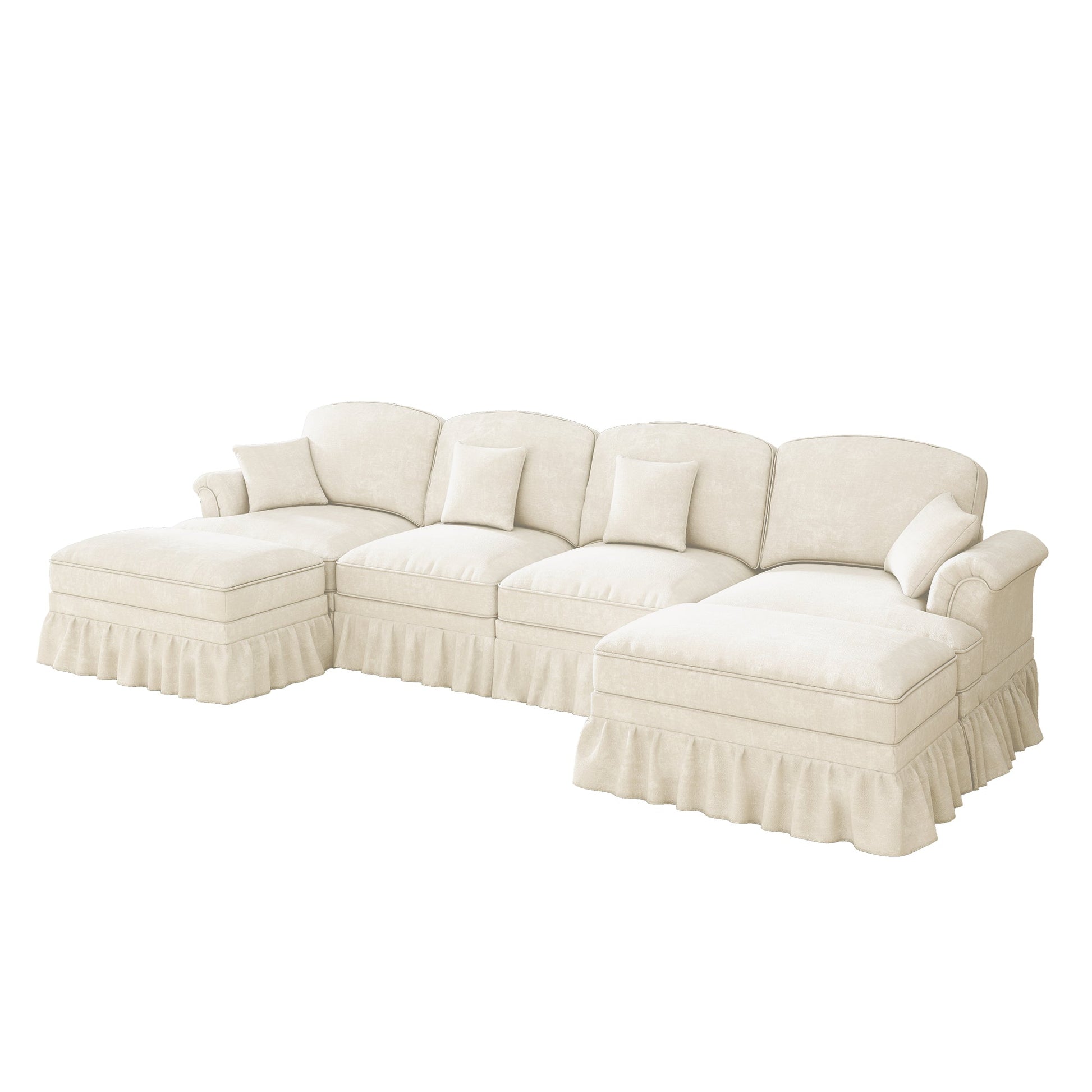 Modular U-Shaped Sofa 4-Seater Movable Ottoman Removable Apron - White Chenille