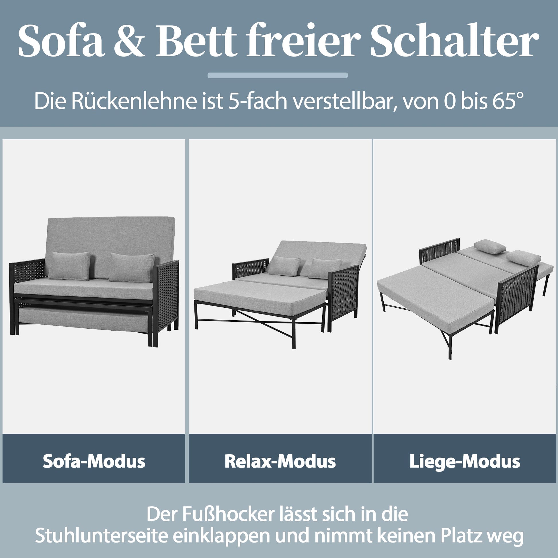 Outdoor Lounger Garden Sofa for 2 People with Adjustable Backrest and Retractable Footrest, Grey