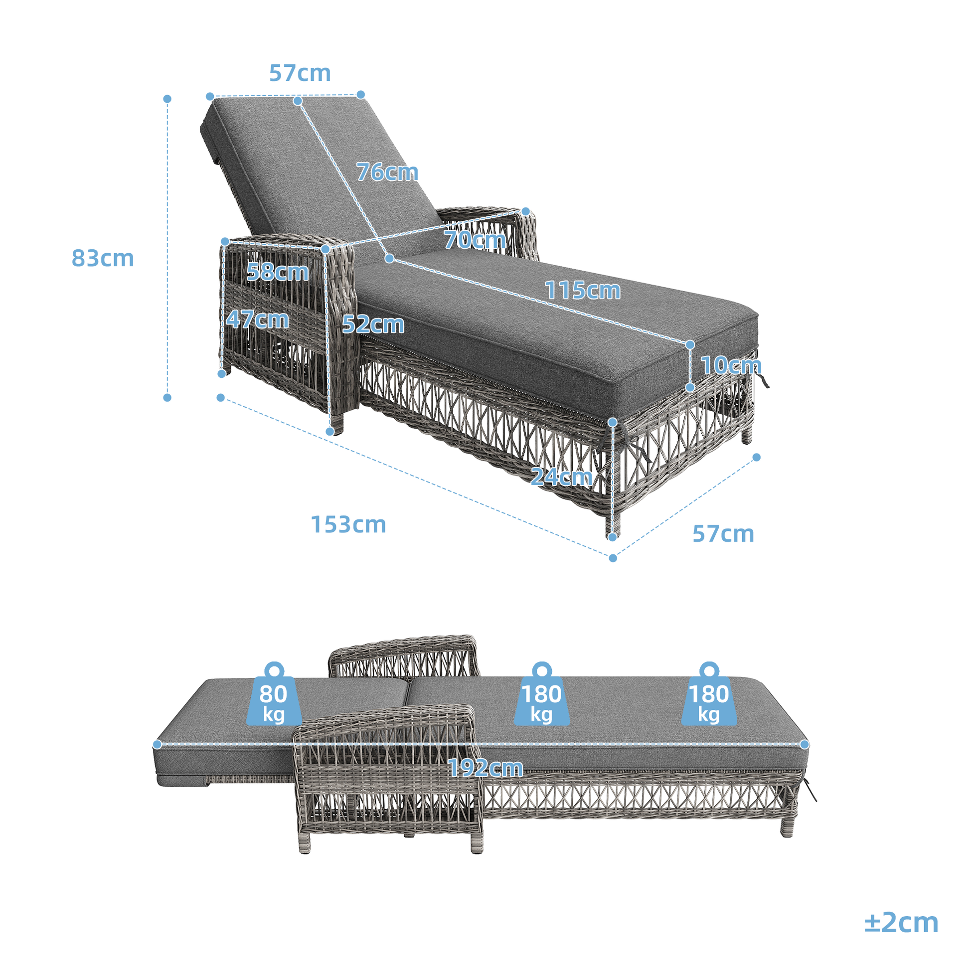 This outdoor lounger is designed with thoughtful dimensions for both comfort and flexibility, making it an ideal fit for various outdoor spaces such as patios, balconies, or pool areas. With a total length of 153 cm, a width of 57 cm, and a height of 83 cm, it easily adapts to your space. The backrest can be fully extended to reach a total length of 192 cm, allowing you to stretch out completely and relax. The spacious seat measures 115 cm long and 57 cm wide, with a seat height of 47 cm. The 58 cm high armrests provide optimal support. A 10 cm thick cushion ensures soft comfort and is secured with straps to prevent slipping. The 24 cm high rattan frame gives the lounger stability and a light, airy appearance. Please note that all dimensions are subject to a tolerance of plus or minus 2 cm, which is typical for the handcrafted nature of rattan.