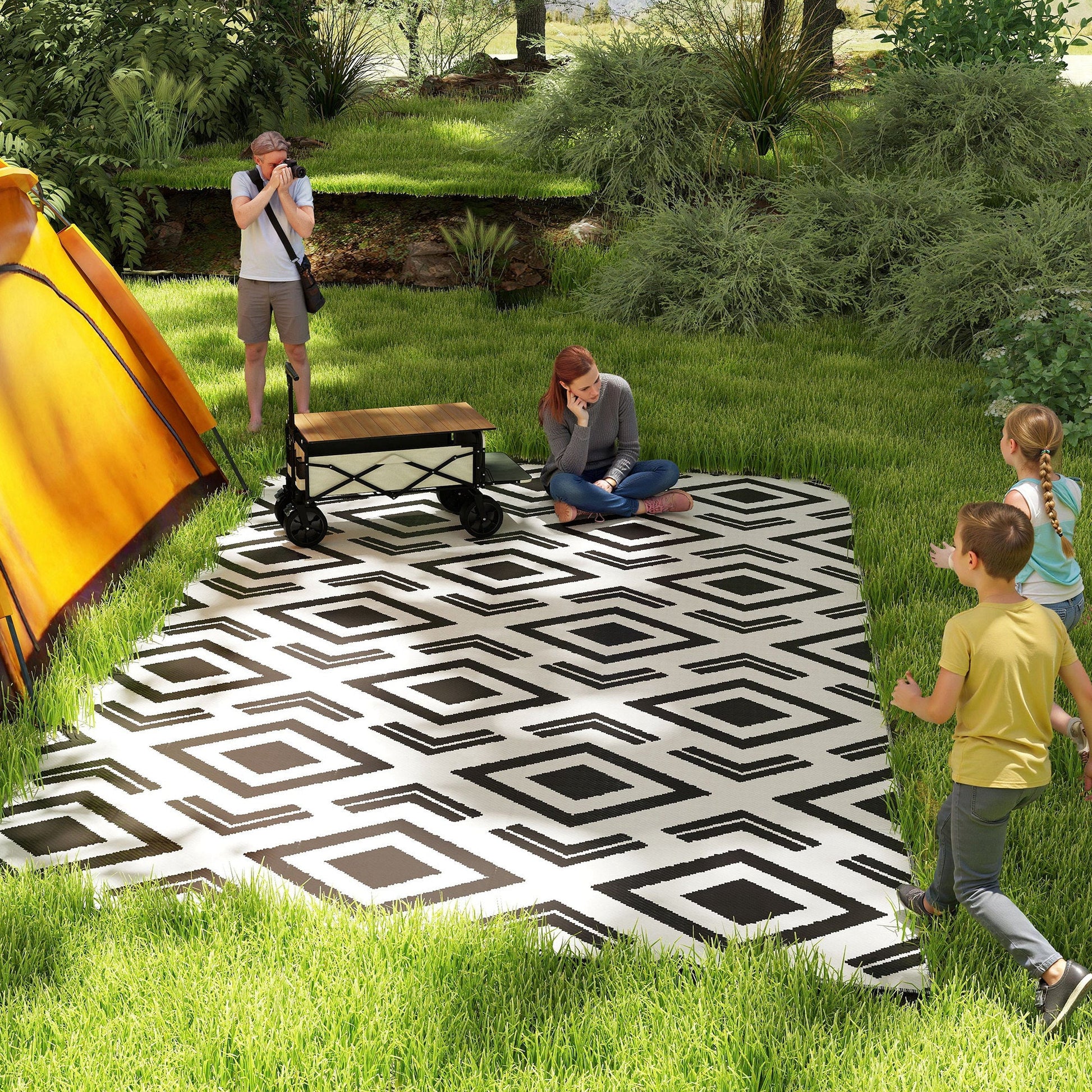 Easy to Carry with a Bag: Thanks to its lightweight design and compact folding capability, this weatherproof outdoor rug is easy to transport anywhere. It is perfect for traveling by car or RV, camping trips, a day at the beach, or relaxing in your own backyard.