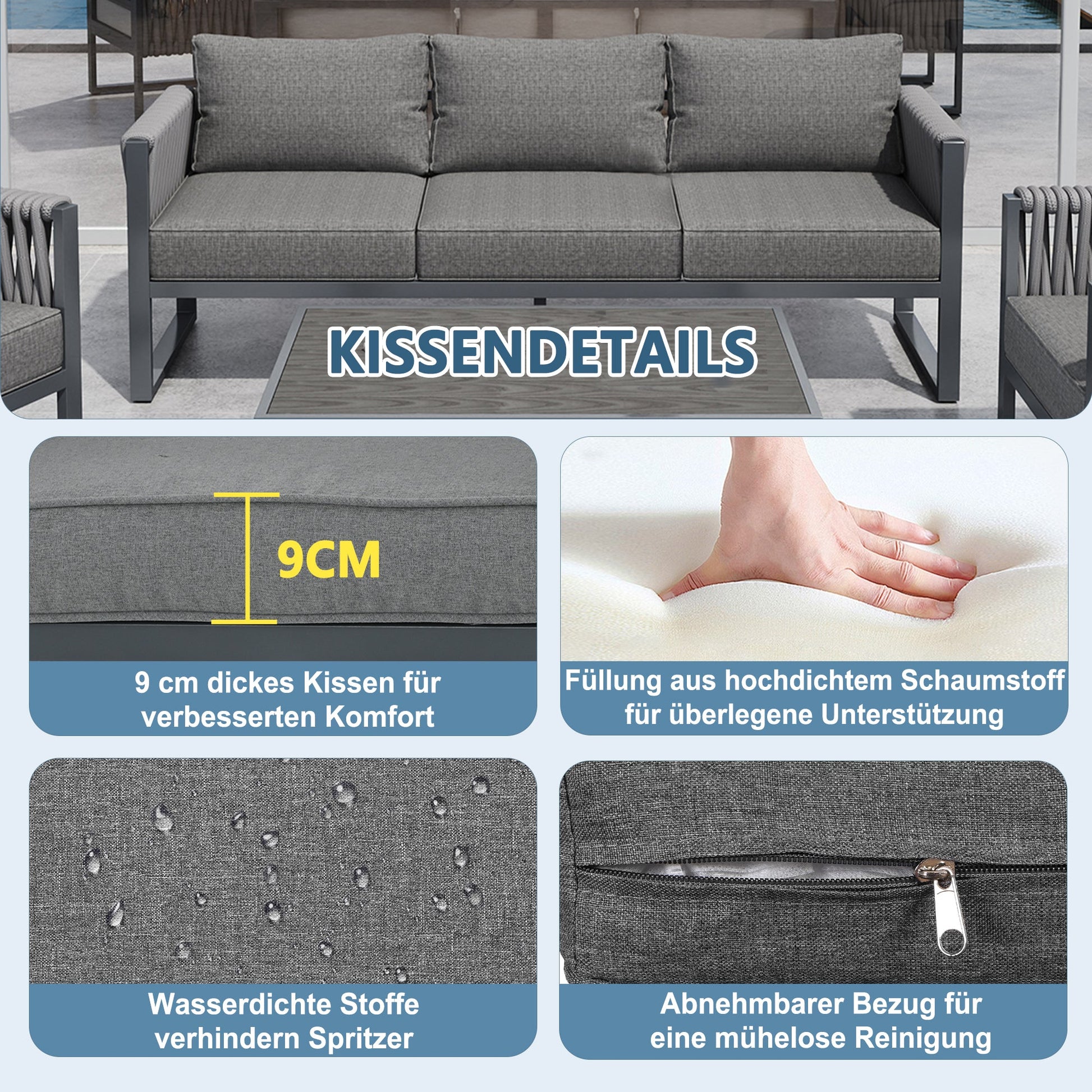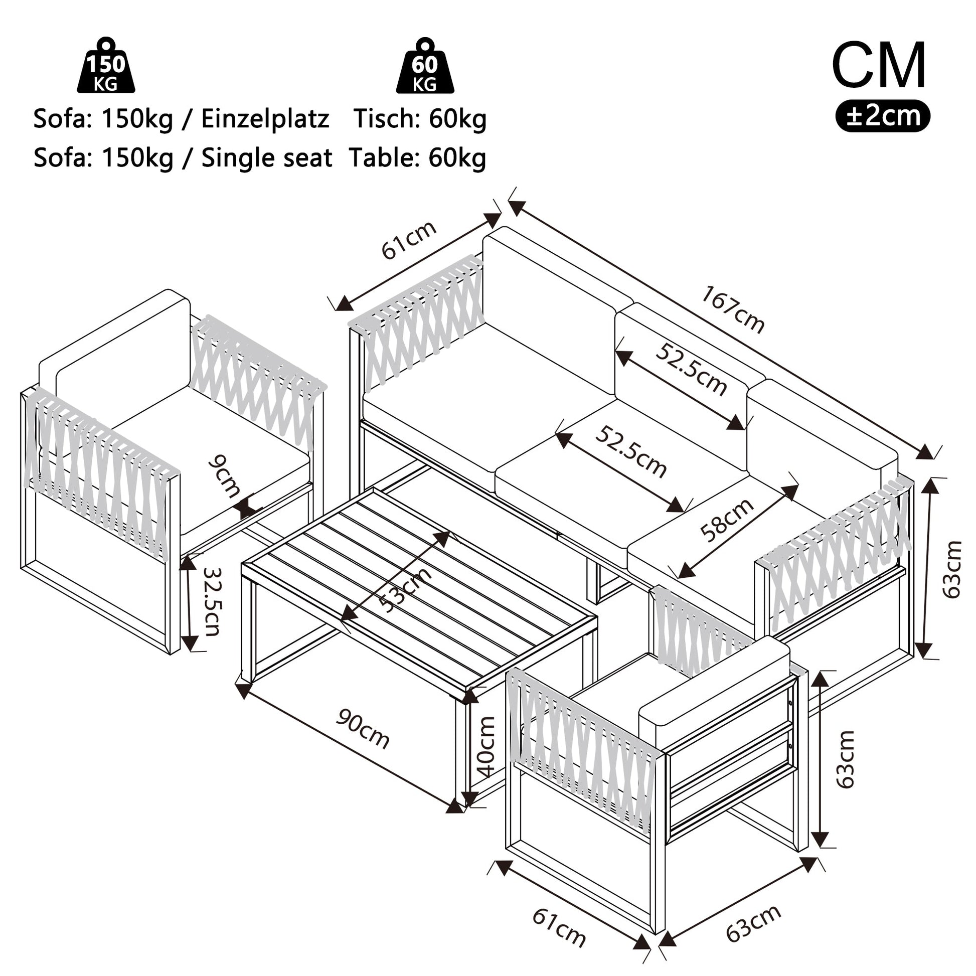 This outdoor sofa set is specially designed for outdoor use. The frame is made of high-quality galvanized iron tubing, which is rust and corrosion resistant, combined with a sturdy metal base and adjustable feet for a secure stand on any surface. The thickened, weatherproof ropes are not only pleasant to the touch but are also exceptionally colorfast and dimensionally stable, offering a significantly longer lifespan compared to conventional ropes. Whether on the balcony, patio, or in the garden, this set withstands even intense sunlight and rain, maintaining its shape and aesthetic appeal. It is the perfect choice for year-round outdoor relaxation.