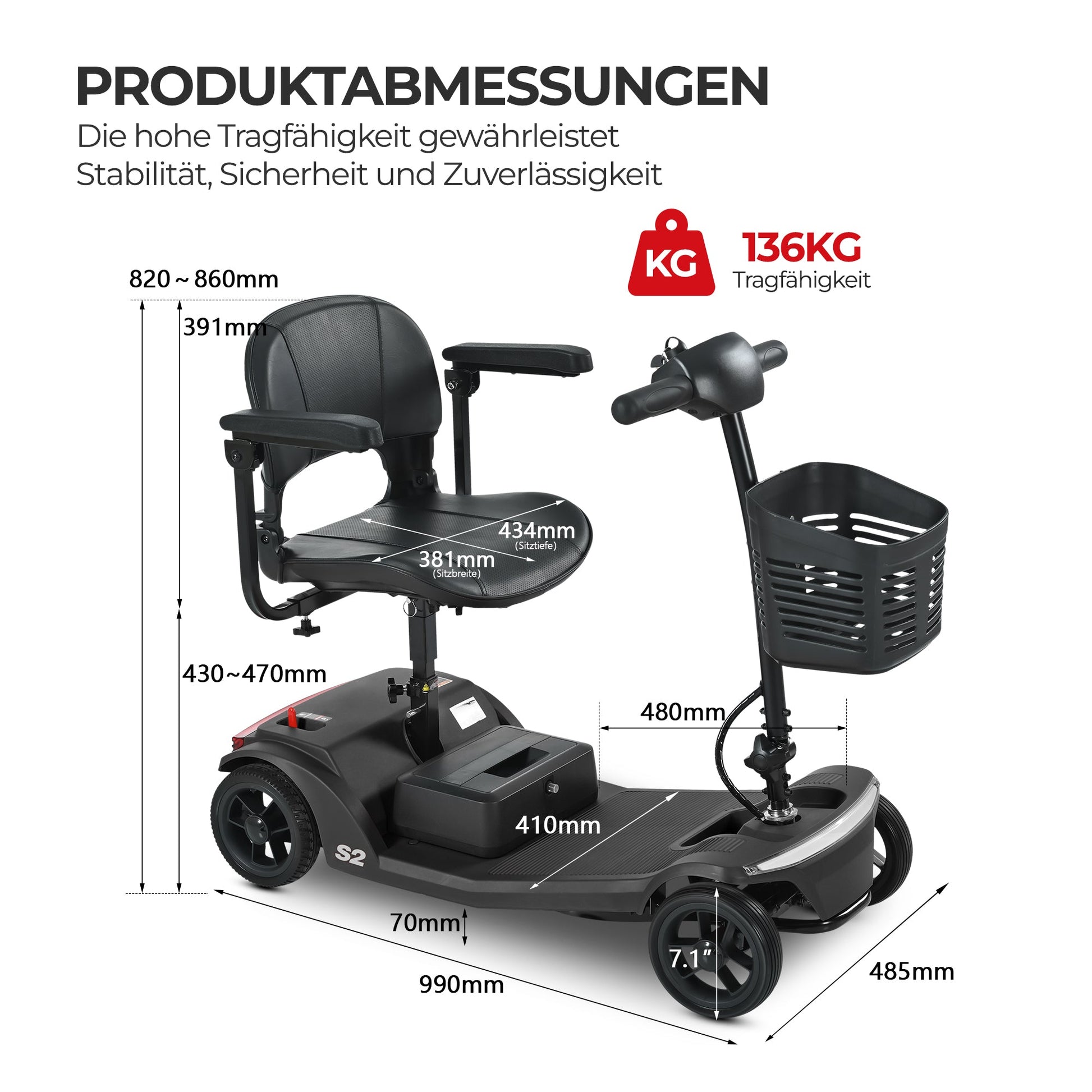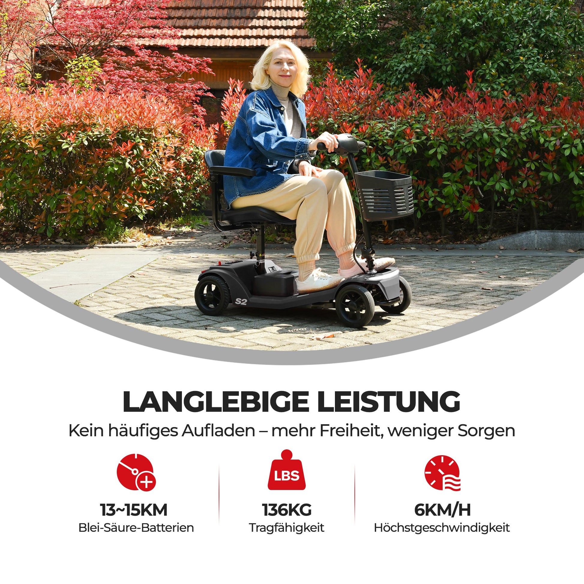 This mobility scooter offers a 15 km range thanks to its removable 12 Ah lead-acid battery configuration, making it practical for long-distance journeys.