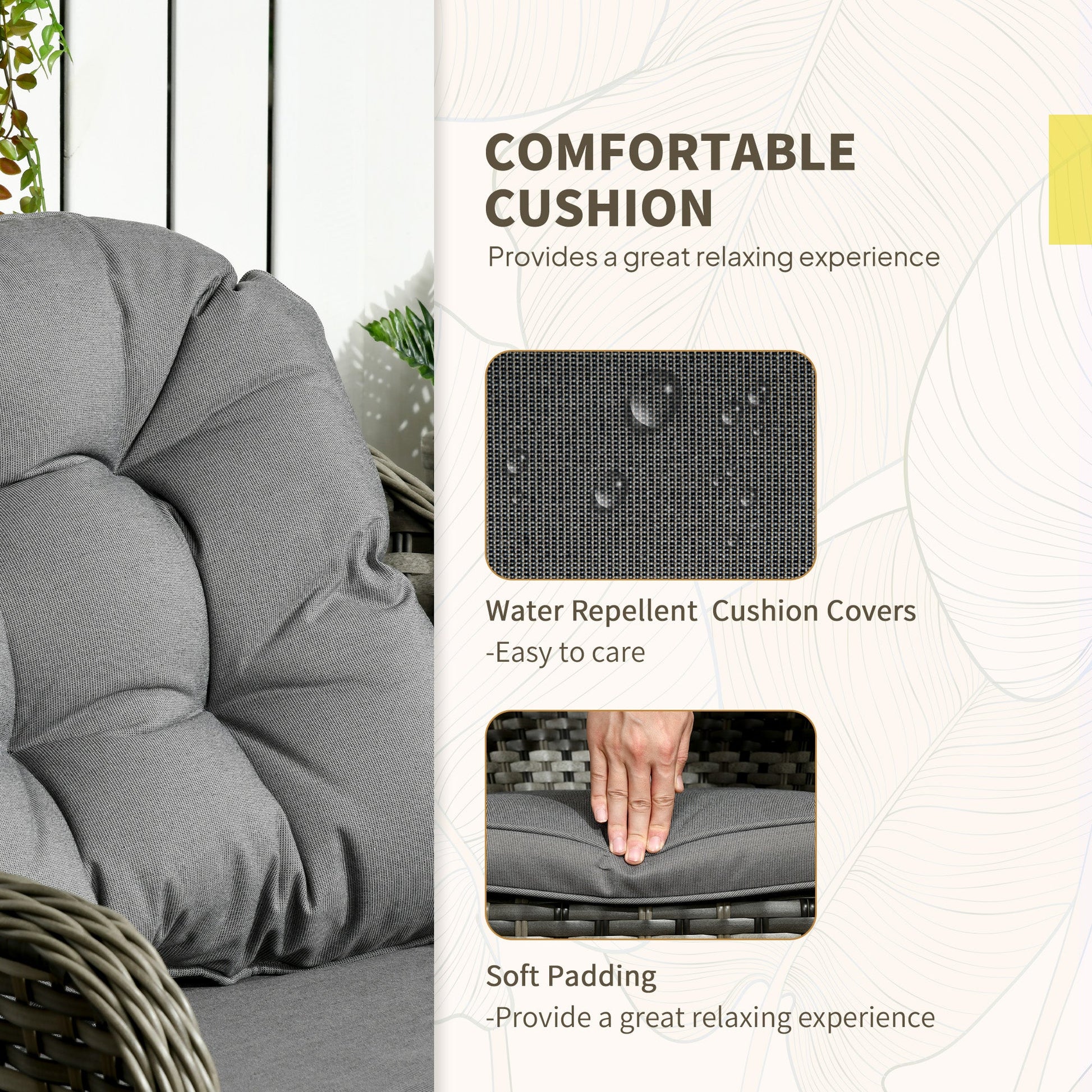 The balcony furniture is comfortable, featuring seat and back cushions on the chairs, allowing you to sit for long periods. The strong core of the set is an aluminum frame, which is powder-coated for extra strength. The plastic wicker wrapping adds extra durability and style.