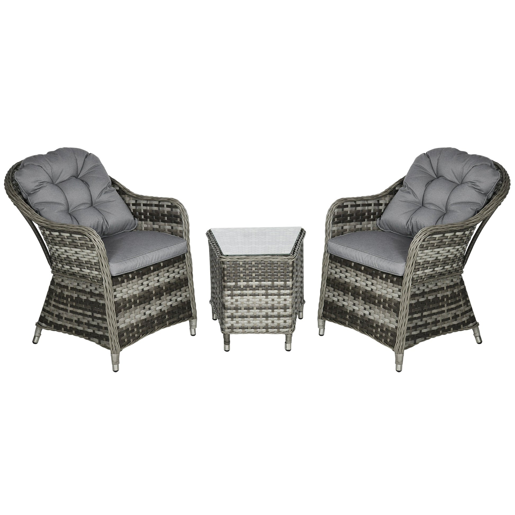 Rattan Bistro Set, 3 Piece Wicker Glass Table and Chairs with Cushions, Grey
