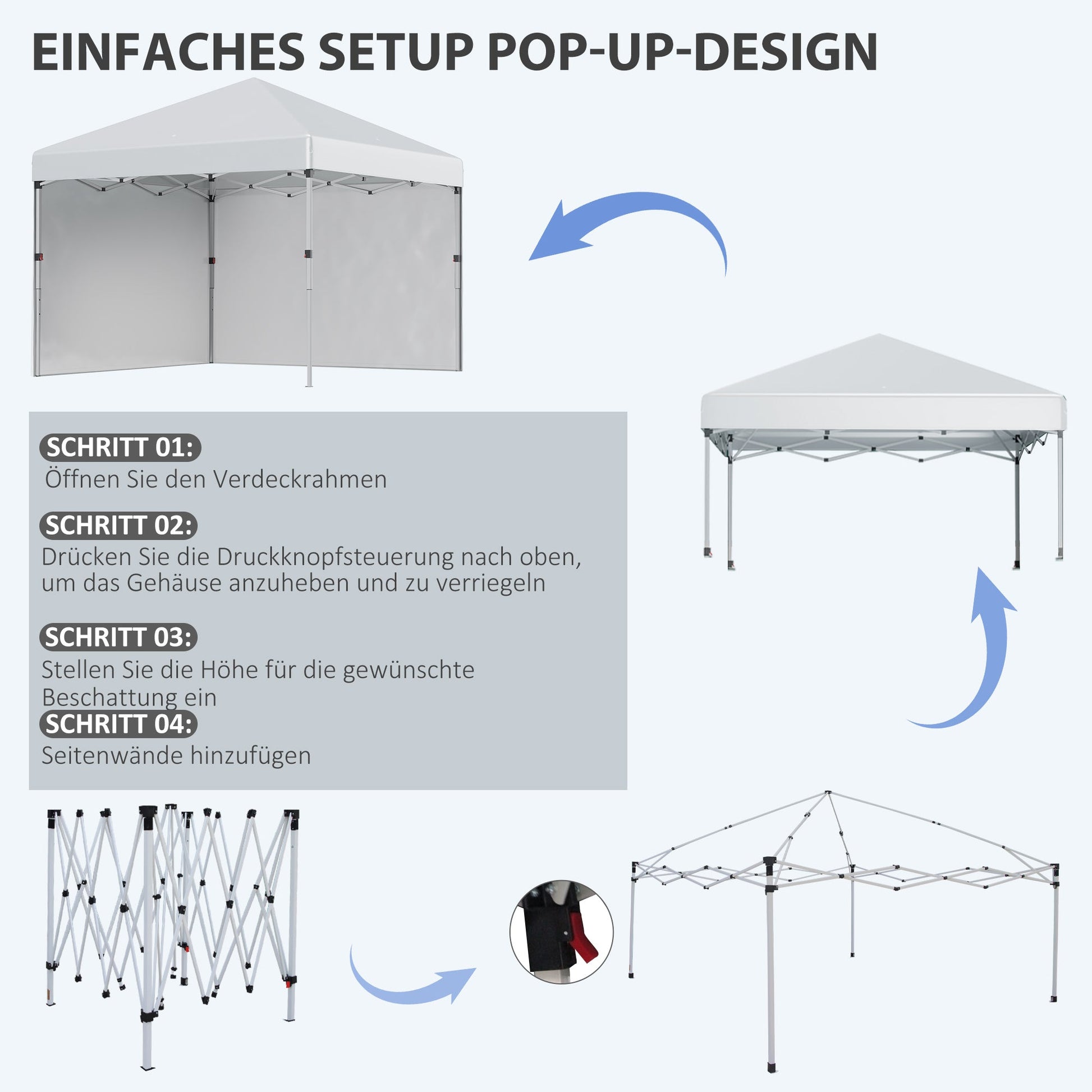 Easy setup & transport: Simply pull the pop-up gazebo upwards, drape the canopy over the frame, extend the legs, and you're done! Thanks to the foldable steel frame and carrying bag, the pop-up tent is also easy to store.