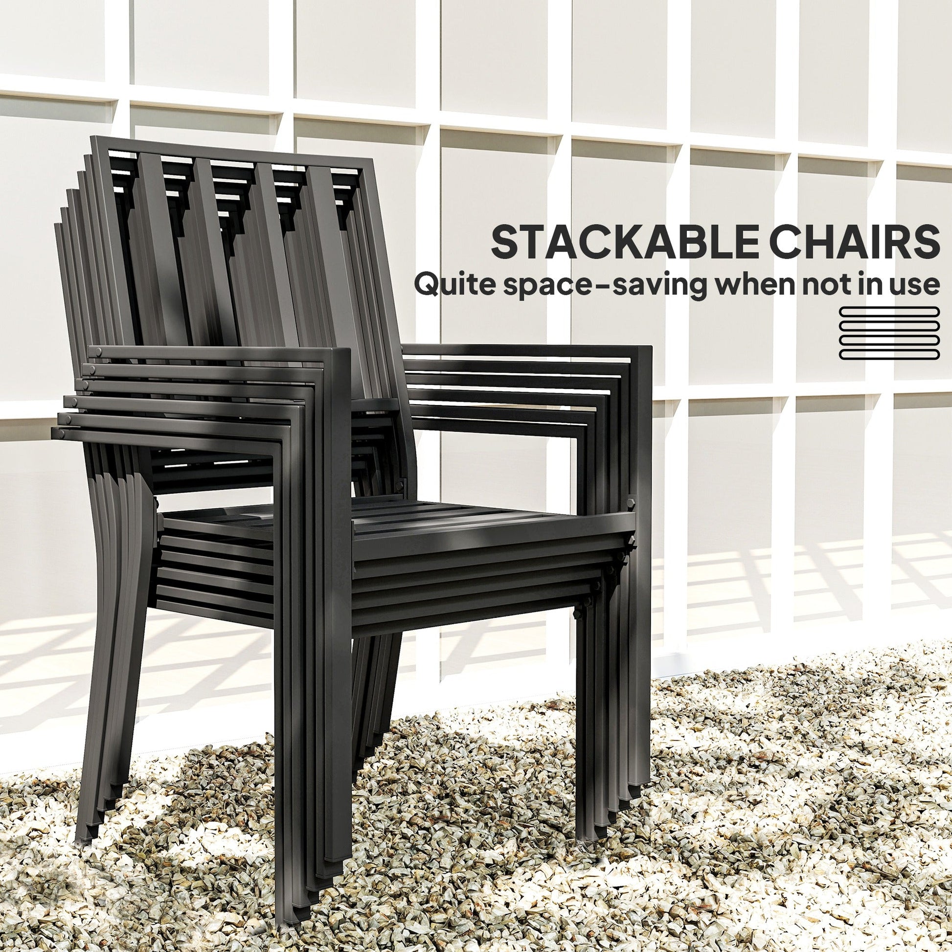 Seven-piece garden dining set includes six stackable chairs and a matching dining table, providing space-saving room for family use.