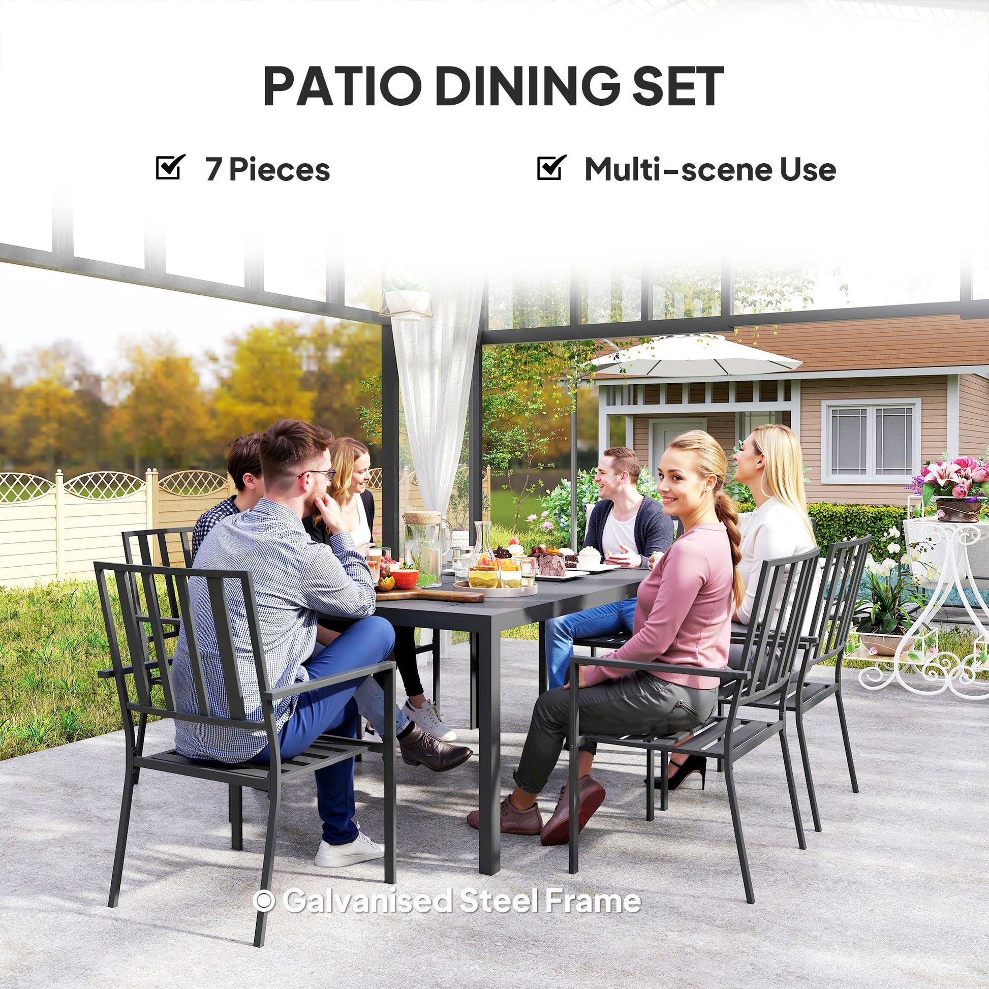 Seven-Piece Garden Dining Set with Parasol Hole - Minimal Metal, Black