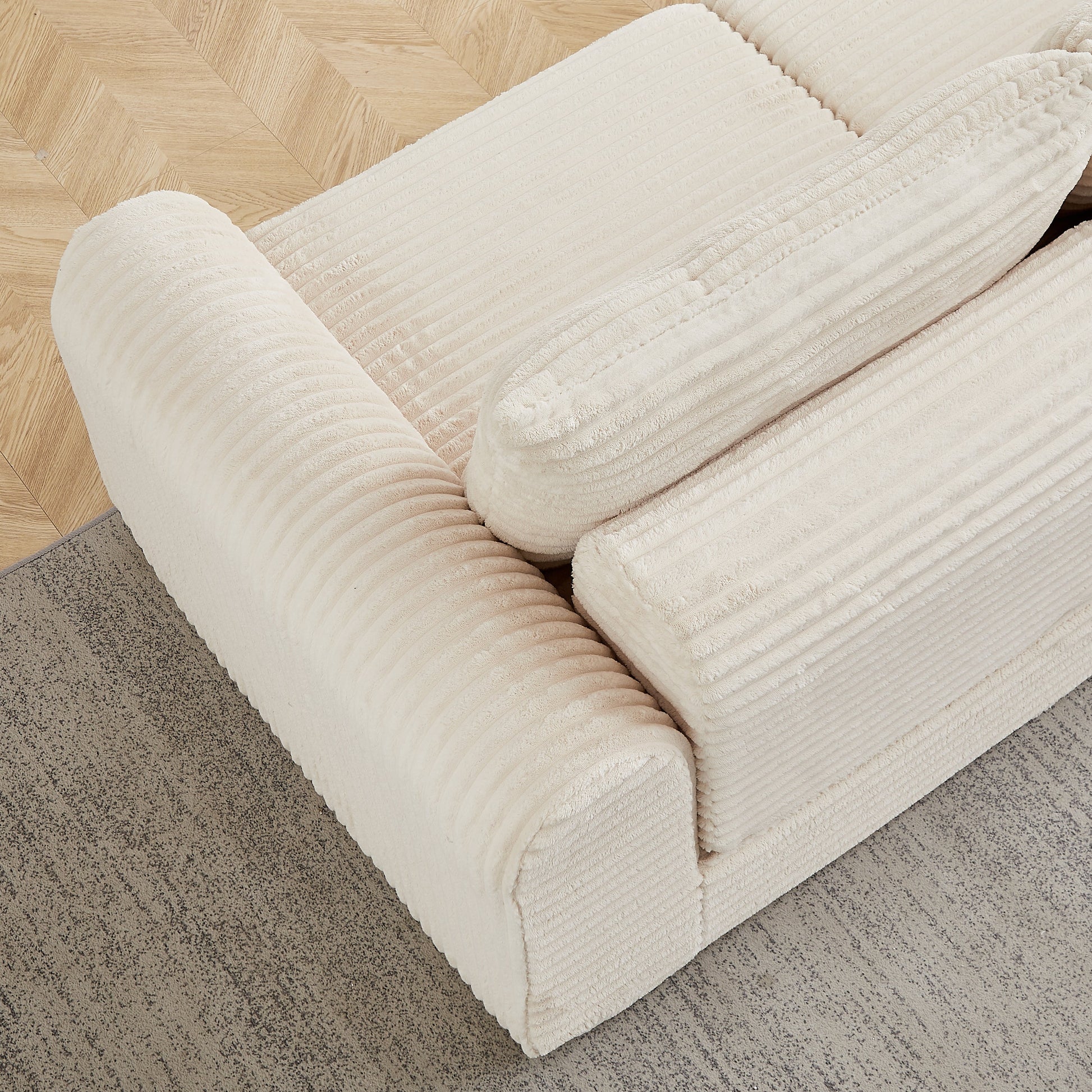 Upholstered in corduroy fabric, this sofa offers a comfortable experience. The fabric features a pronounced pile texture that creates subtle variations in sheen when touched, providing a particularly appealing effect. Please note that the sofa's color may appear slightly different under varying lighting conditions and ambient colors, which is perfectly normal.