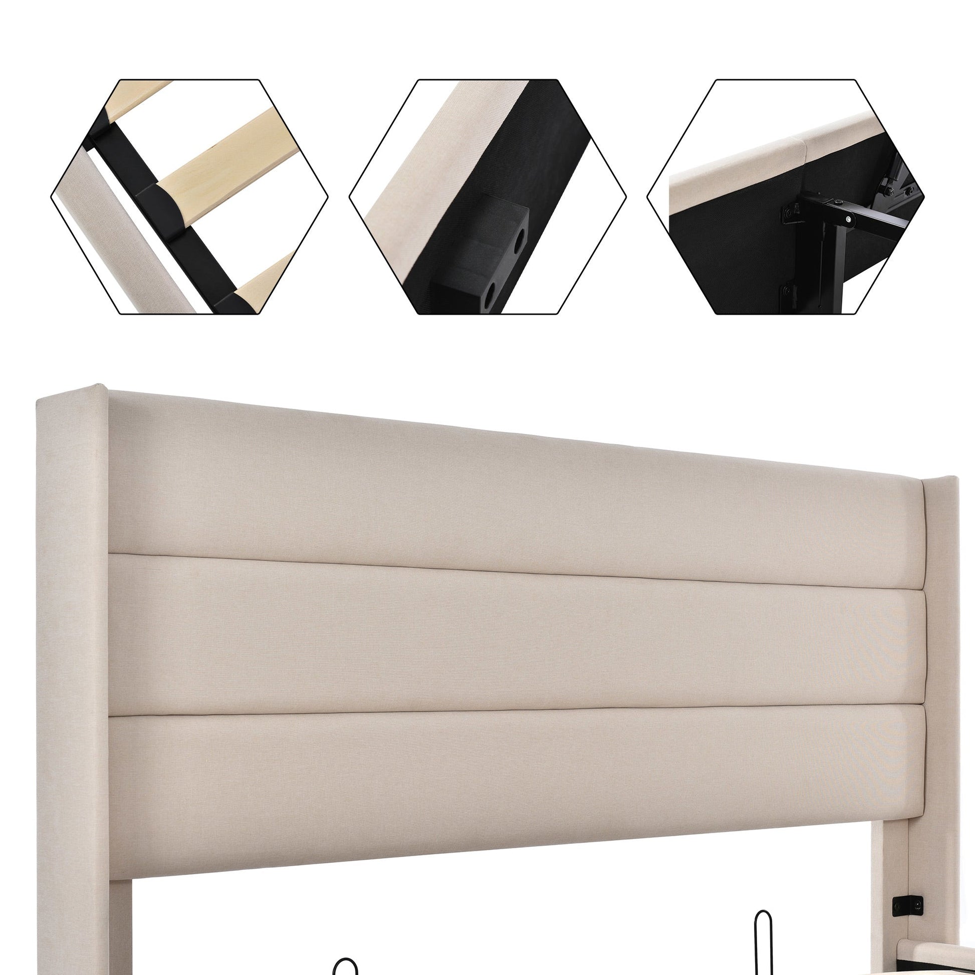 Storage Bed, Hydraulic Double 140x200cm, Wood & Metal Frame, Linen Beige
