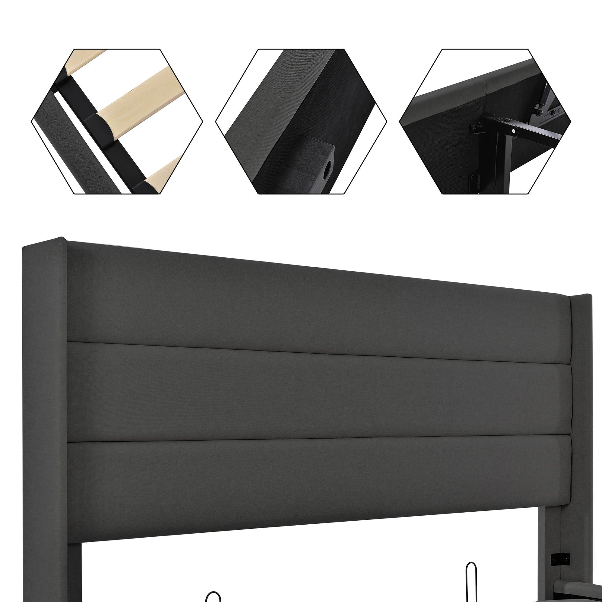 Storage Bed, Hydraulic Upholstered Double Bed 140x200cm, Slatted Base, Linen Grey