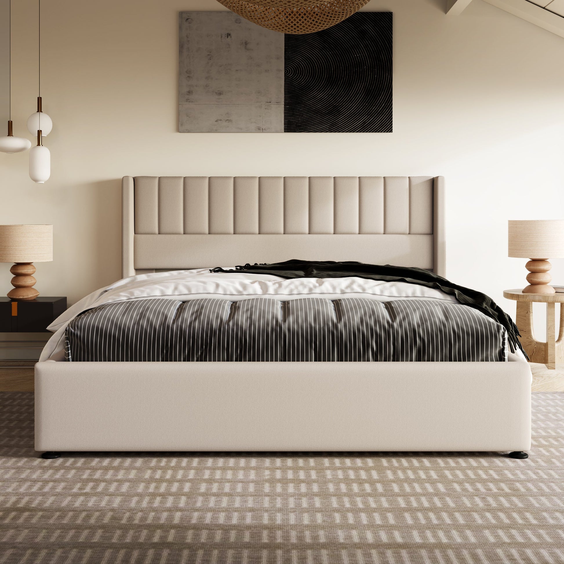 Storage Bed, Upholstered Hydraulic Double Bed 140x200cm, Linen Beige