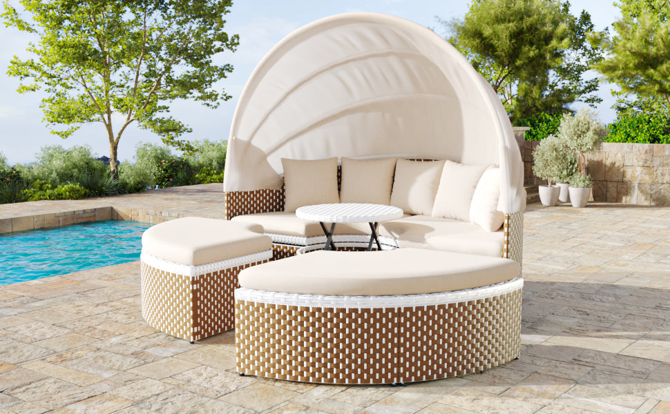 Sun Island Garden Lounge Set Rattan Extendable Canopy Liftable Table Beige
