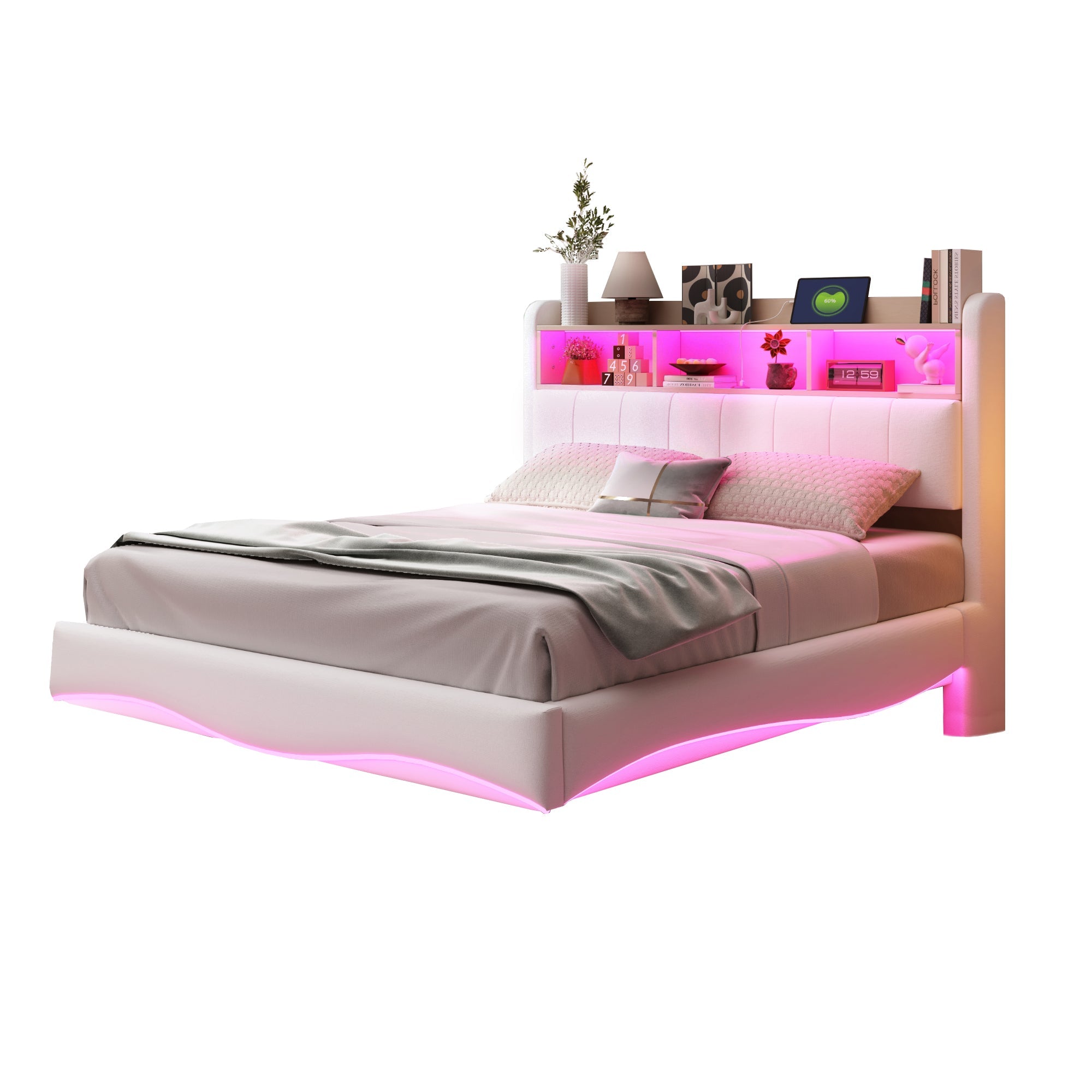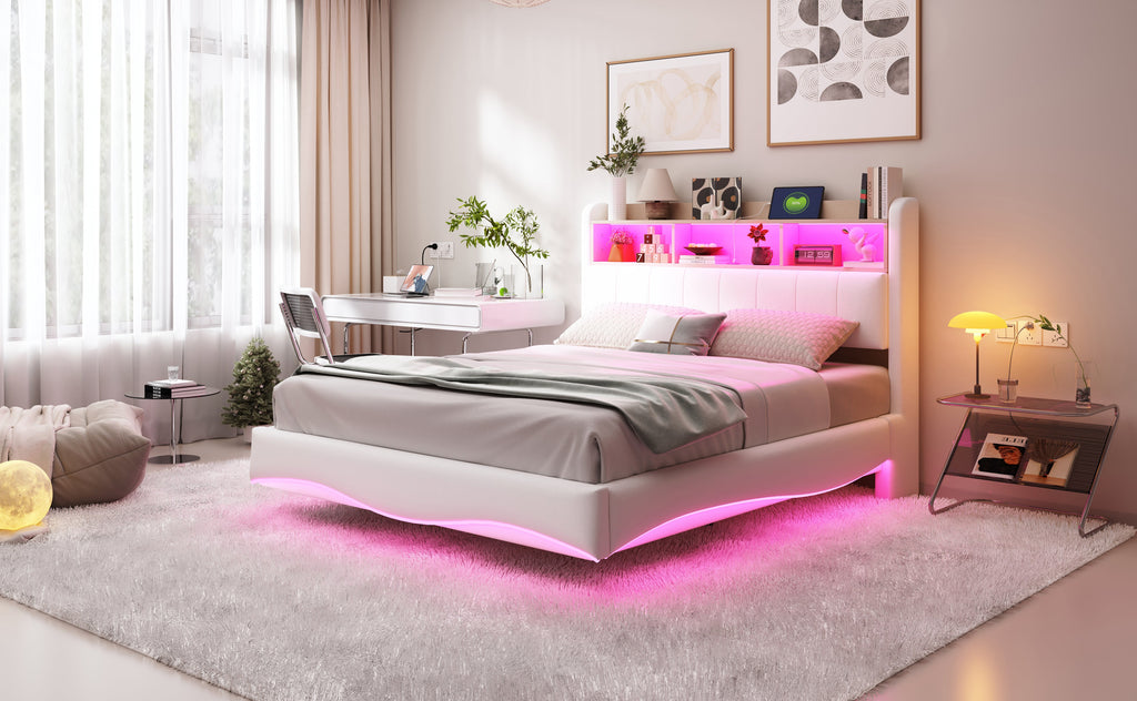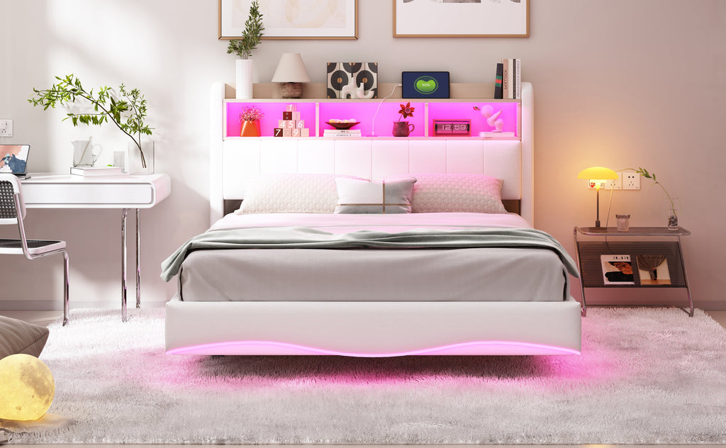 Suspended Design Upholstered Bed 140*200, Multifunctional Storage with LED, USB & Type-C, Linen Fabric Beige
