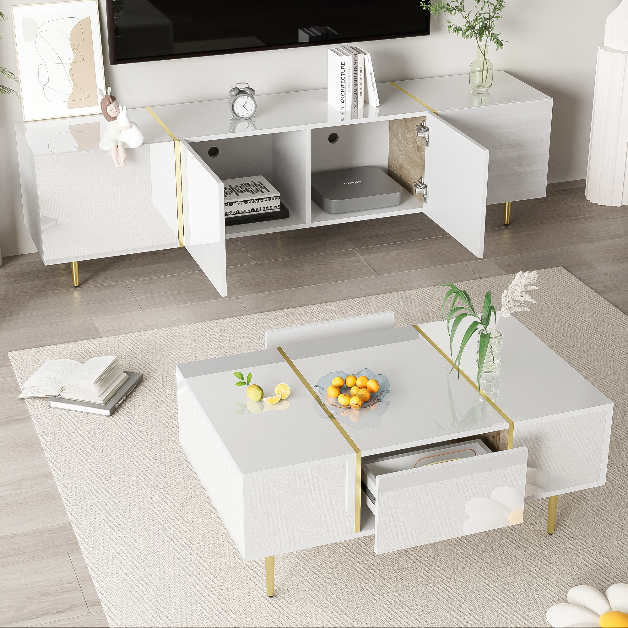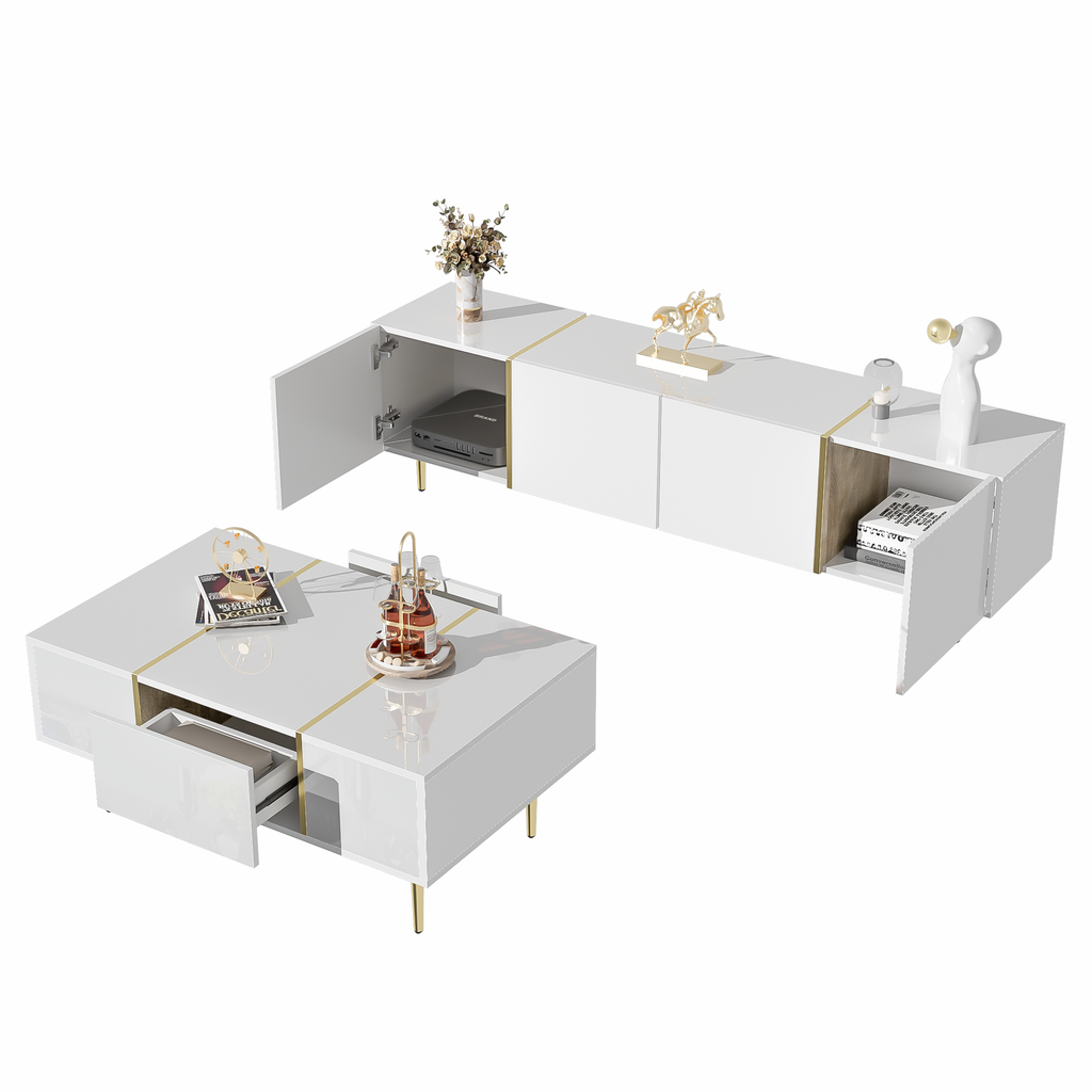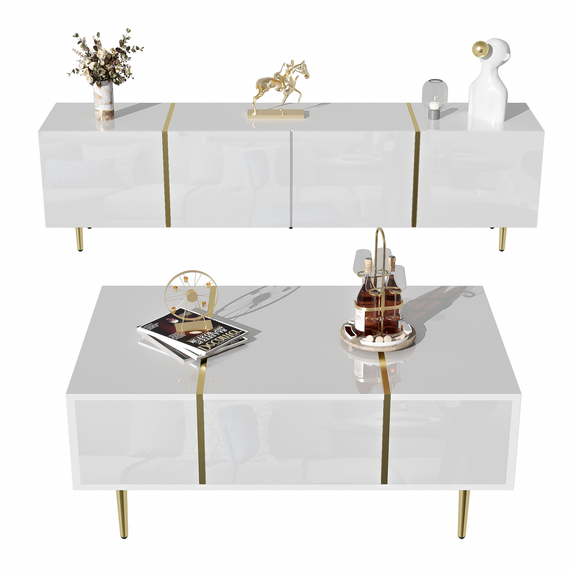Crafted from high-quality MDF and durable metal components, this set is built to last. Elegant gold metal accents add a touch of sophistication, and a protective film on the smooth surface prevents scratches during transport or assembly. Whether you're looking to decorate your living room or add a stylish focal point, this modern TV cabinet and coffee table set is the perfect choice.