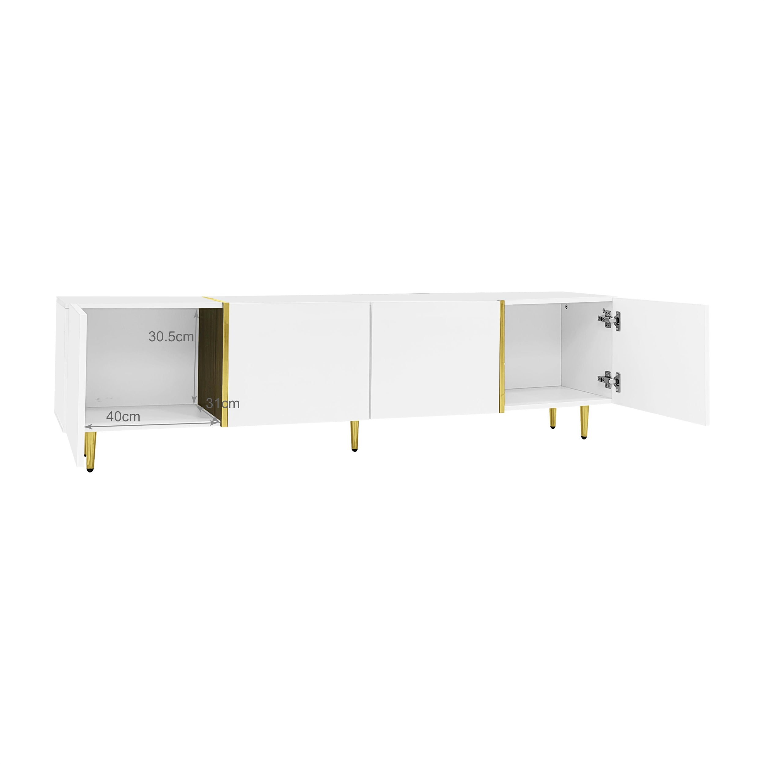 The TV cabinet measures 170 cm (L) x 35 cm (W) x 46 cm (H) and features four spacious doors, offering ample storage for books, remote controls, and other essentials. The smooth white high-gloss finish, combined with elegant gold accents, gives the cabinet a sophisticated and timeless appearance that complements various interior styles. The doors are equipped with soft-closing hinges for quiet and smooth operation, while the high-gloss surface is easy to clean and maintain.