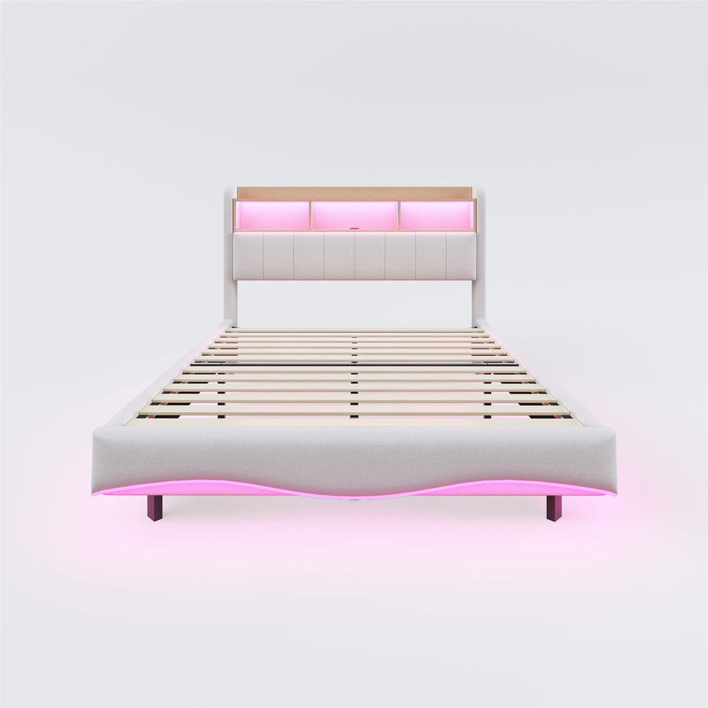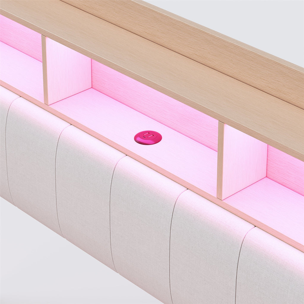 Upholstered Bed, 160*200, Multifunctional Storage, LED Light, USB and Type-C Interface, Beige Linen Fabric