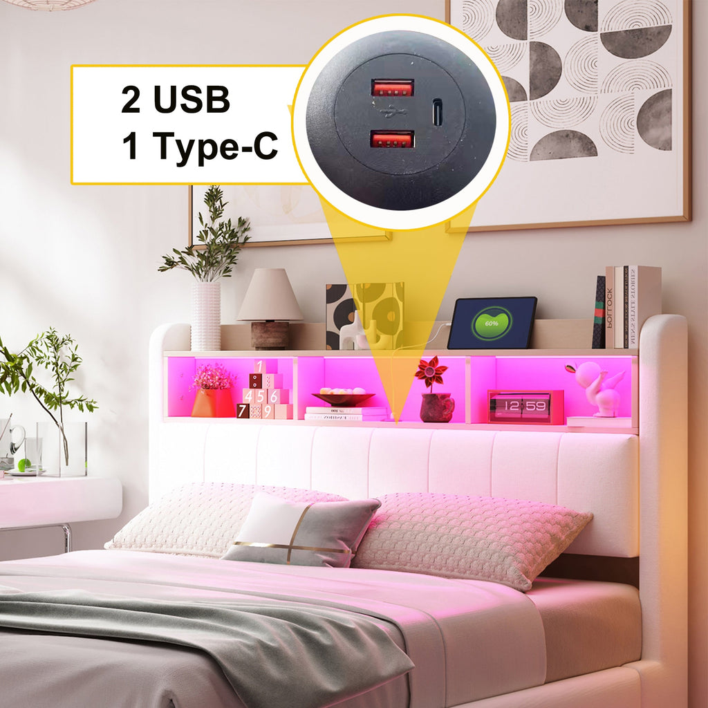The headboard is thoughtfully equipped with USB fast-charging and Type-C ports, providing convenient charging options for your devices. Additionally, the built-in storage space at the head of the bed helps keep your essentials organized and easily accessible.