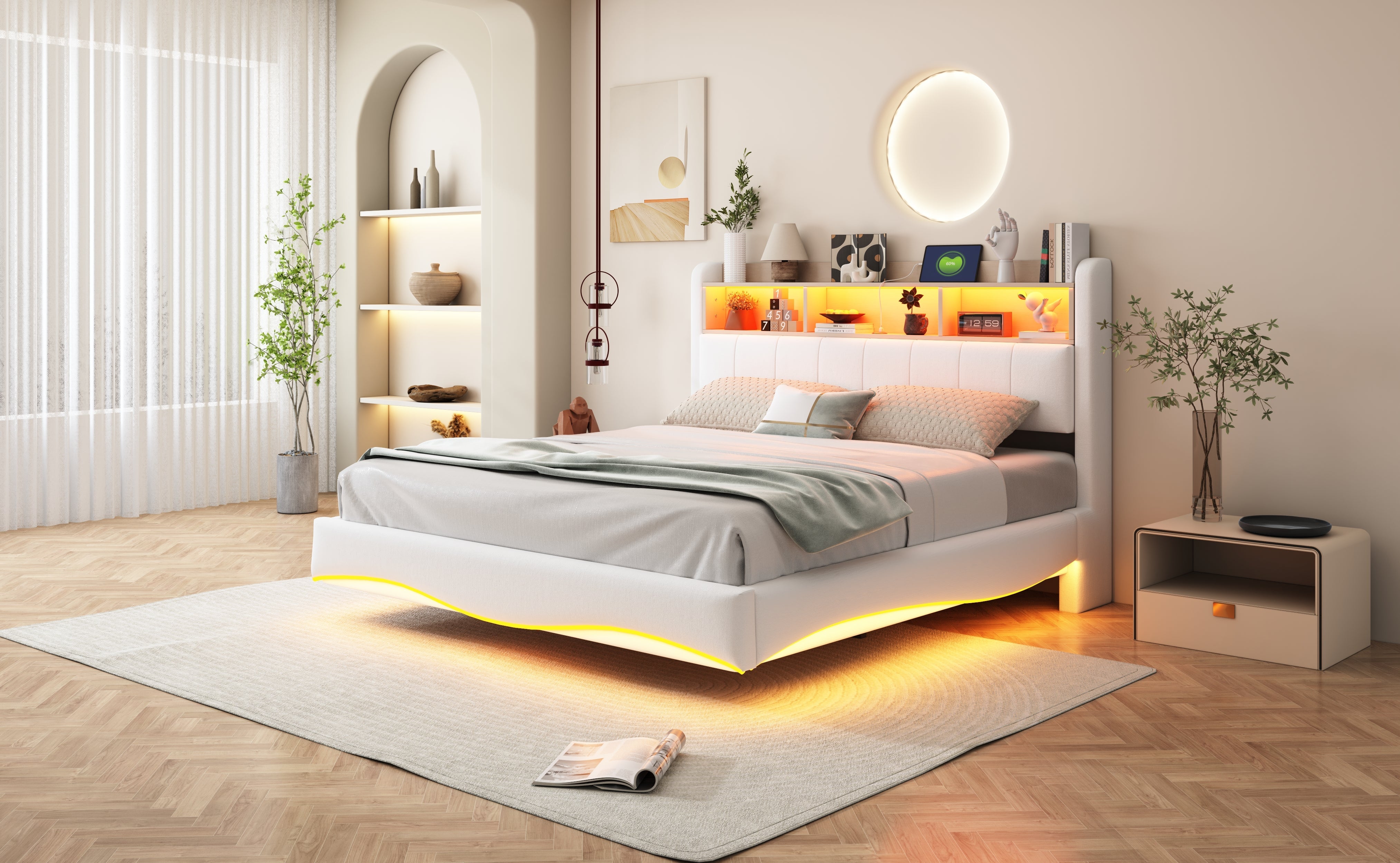 Enhance your bedroom with this modern upholstered suspended bed, combining style, functionality, and technology in a sleek, curved design. The integrated color-changing LED light strip elevates the room's ambiance, creating a relaxing and visually appealing environment. Its floating structure gives the bed a unique look, making your bedroom appear spacious and modern.