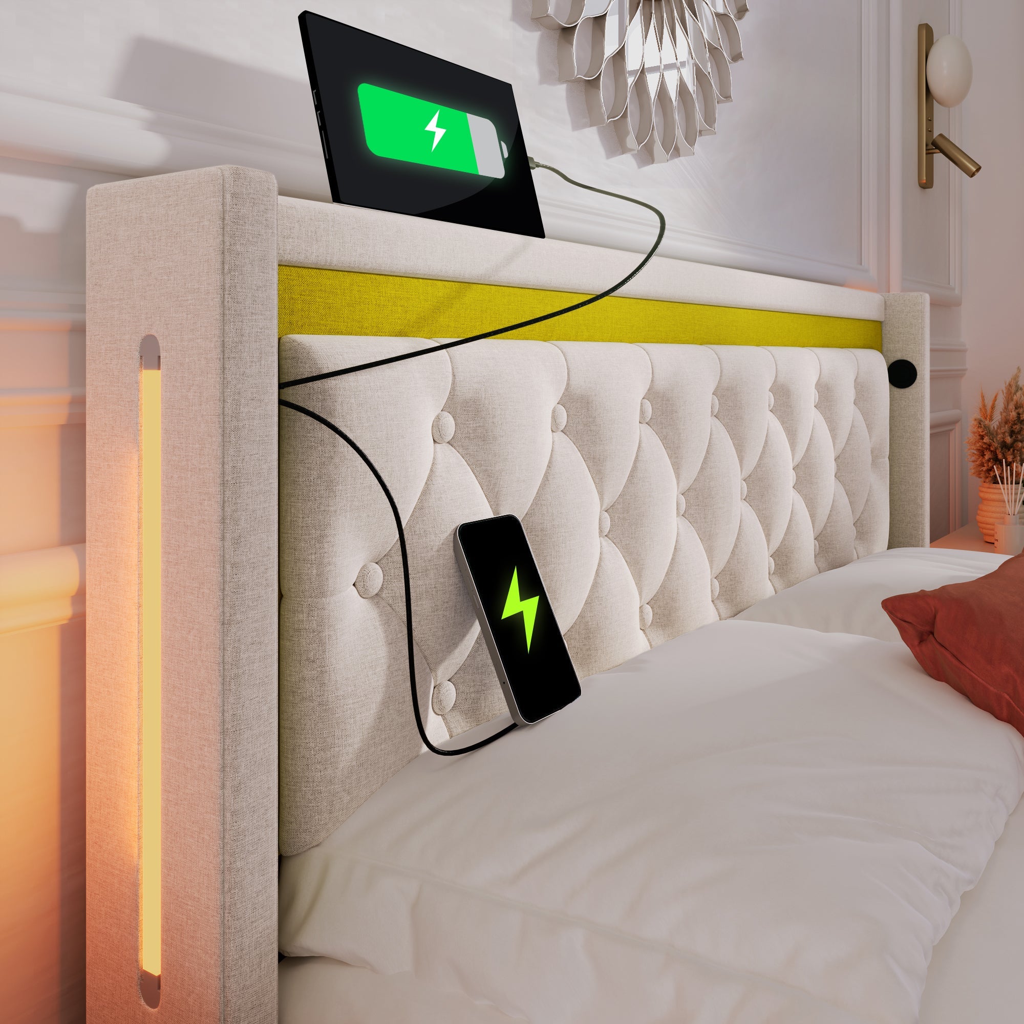 Upholstered Bed, LED Double Bed, Storage with USB & Type C, Cotton