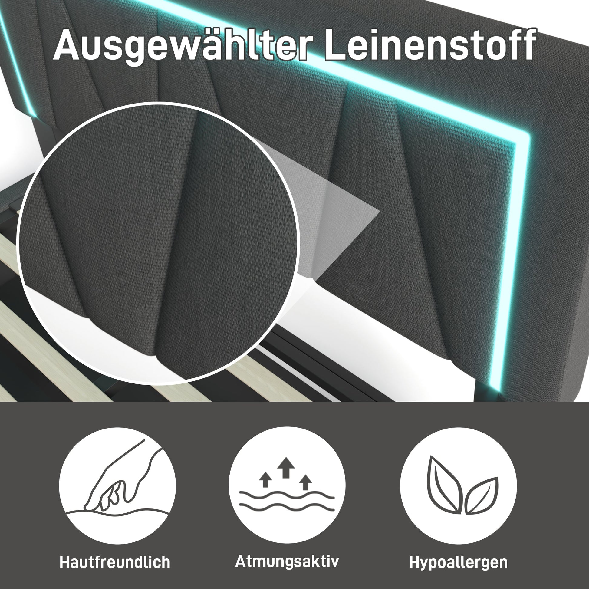 This modern upholstered bed combines elegant design with practical functionality. Featuring a high-quality linen finish in gray or beige, it includes a unique integrated LED lighting system and a built-in charging station with one USB and one Type-C port, allowing you to charge your devices conveniently from bed.