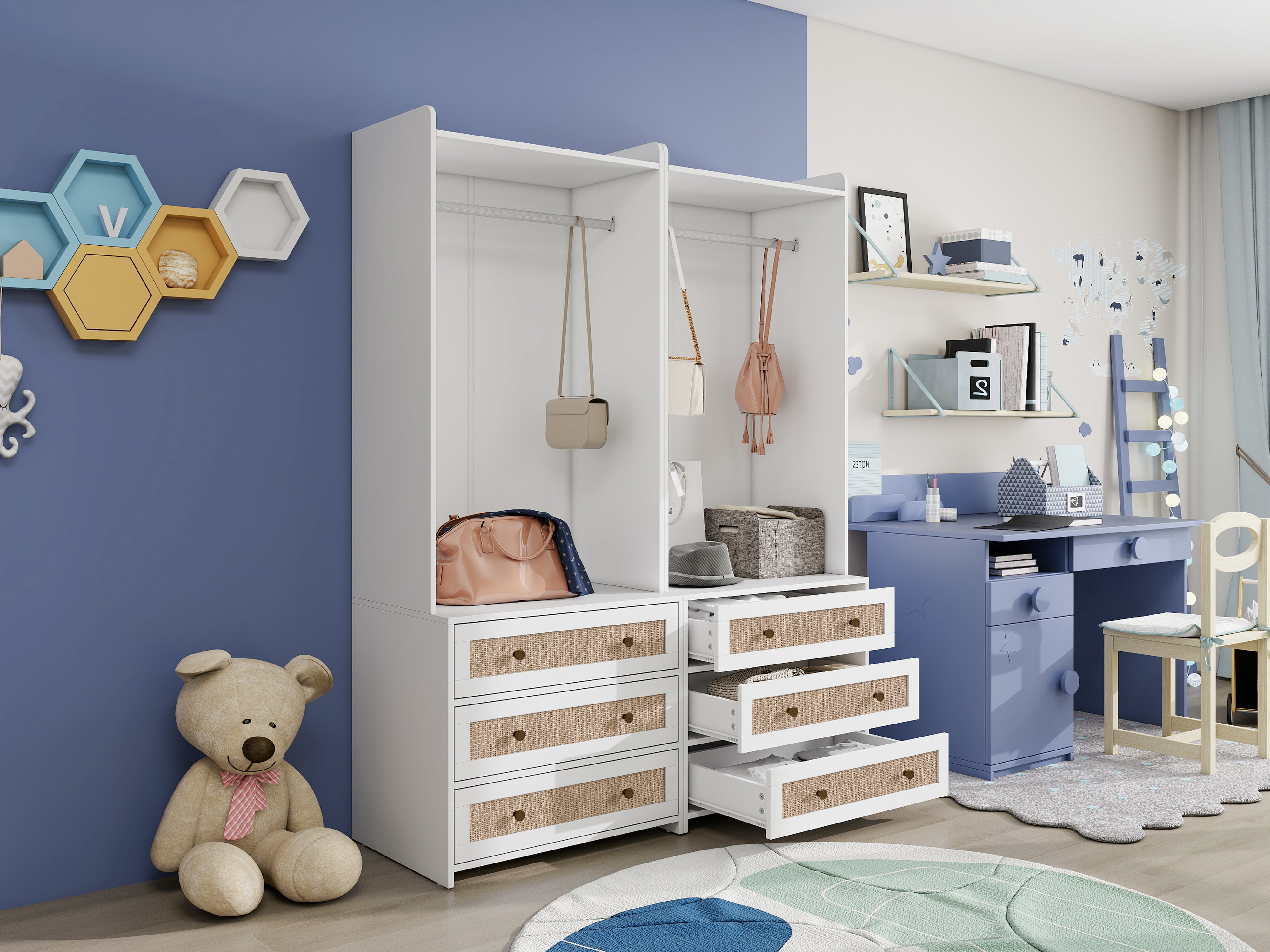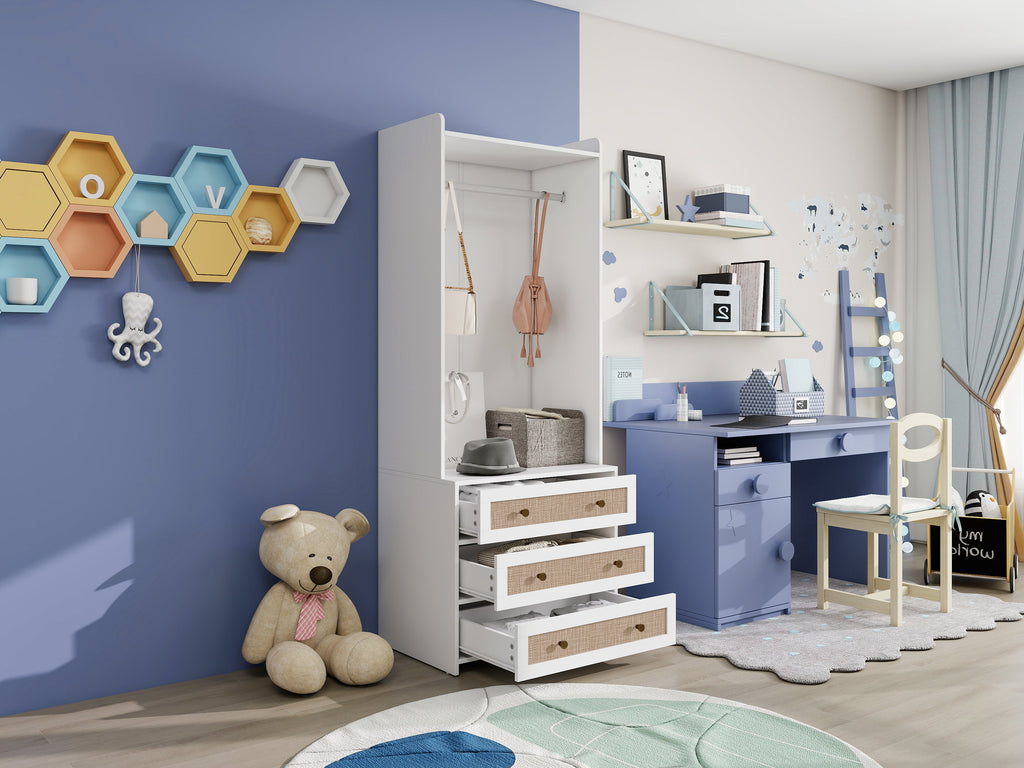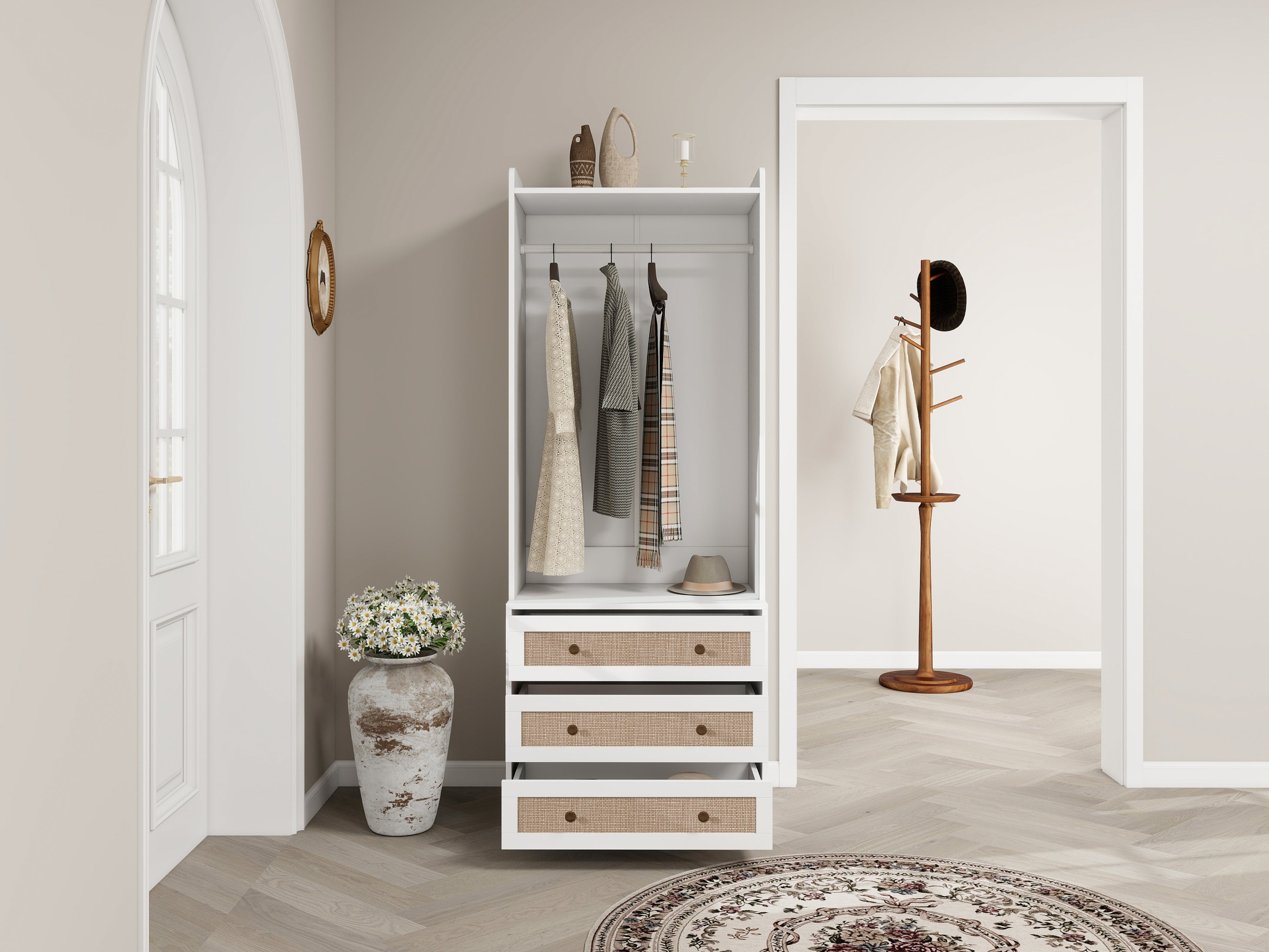 Wardrobe, Three Drawers, Boho-Style, 180cm Height, White
