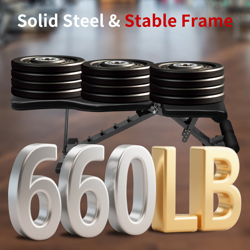 The foldable design of this bench saves space, allowing you to store it conveniently under a bed or desk. This bench has a maximum weight capacity of 272 kg (600 lbs), ensuring a very safe workout.