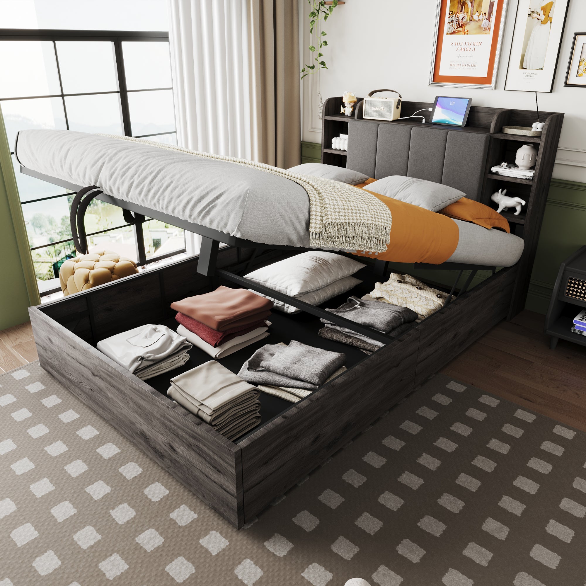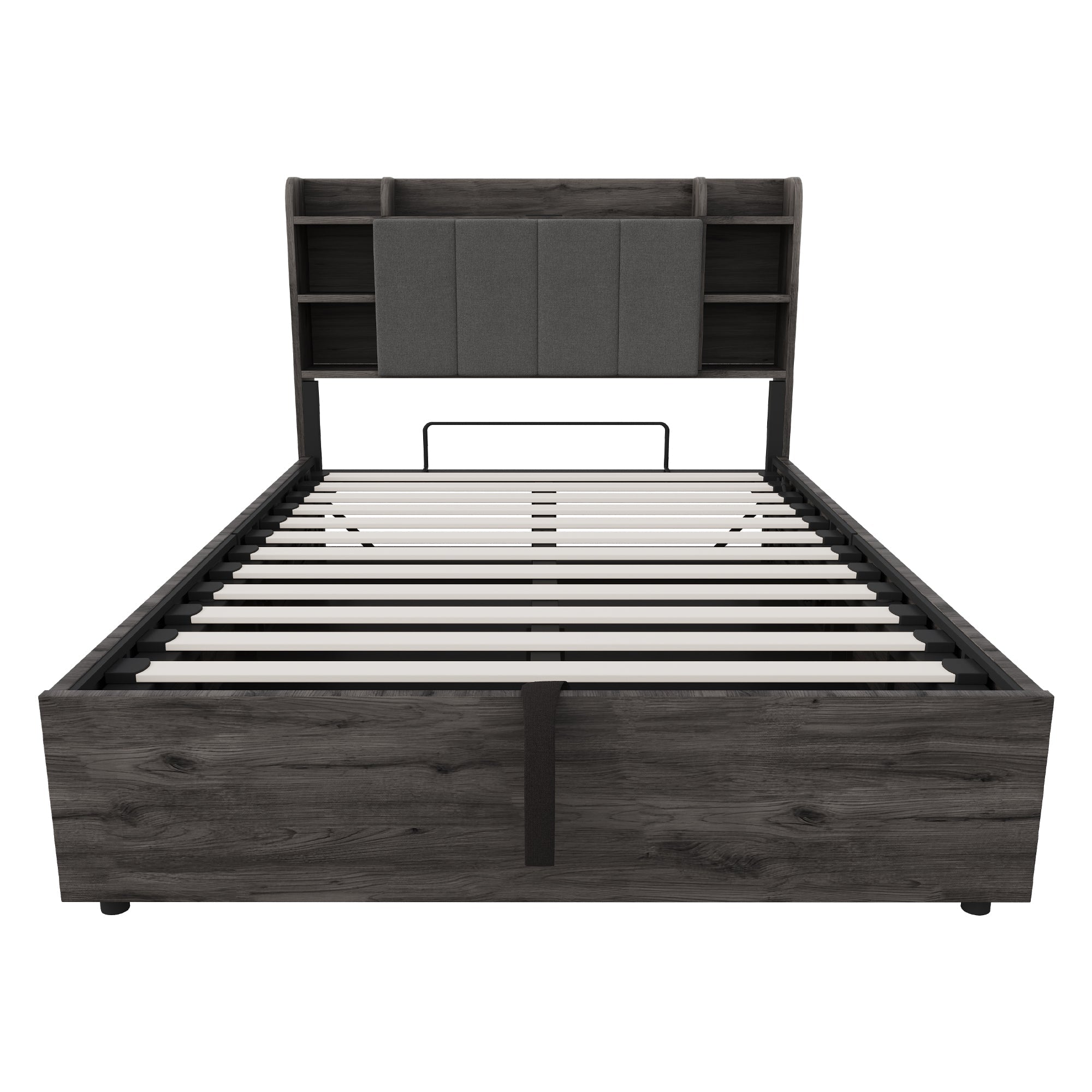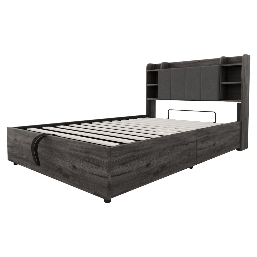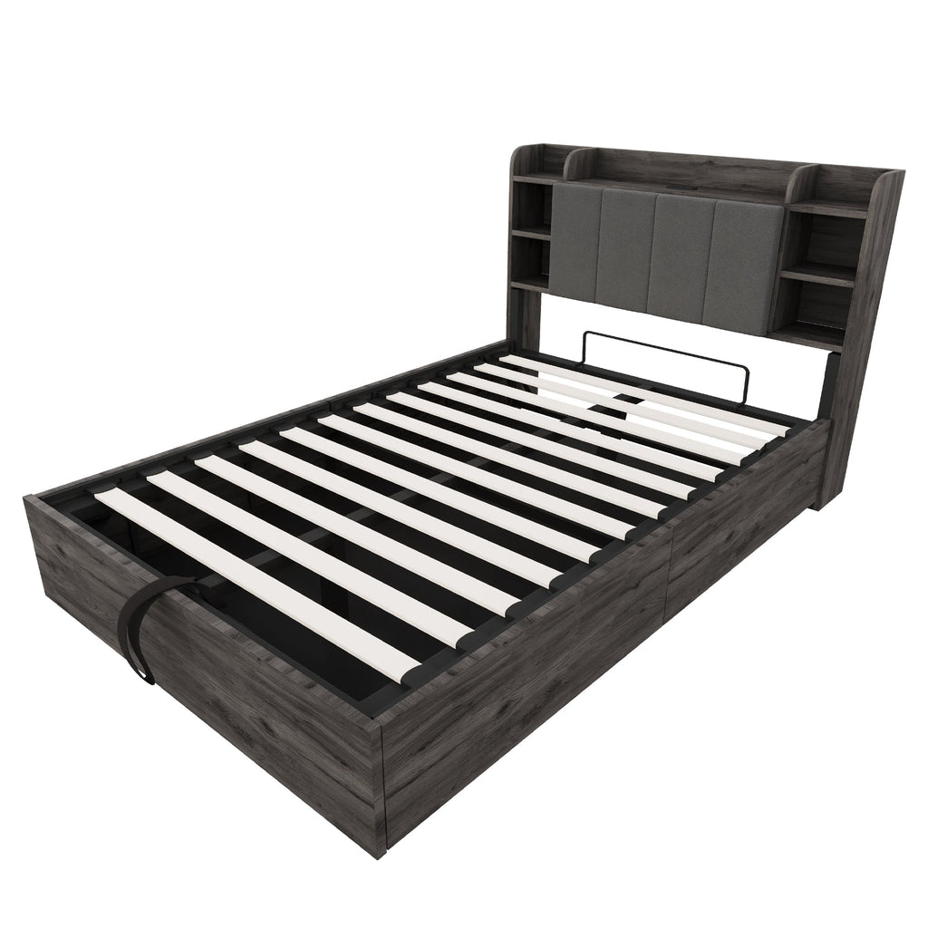 Wooden Bed, 140x200cm Hydraulic with Storage Headboard, USB & Type-C Socket, Grey