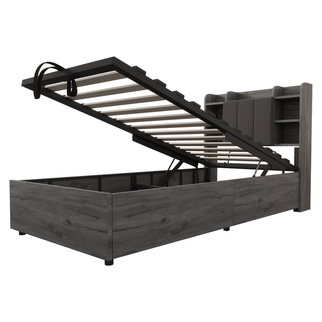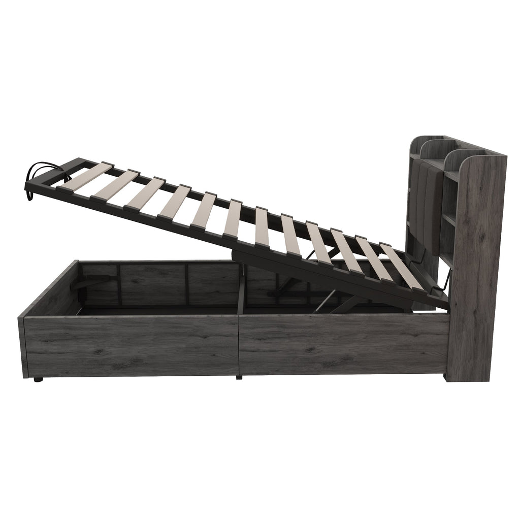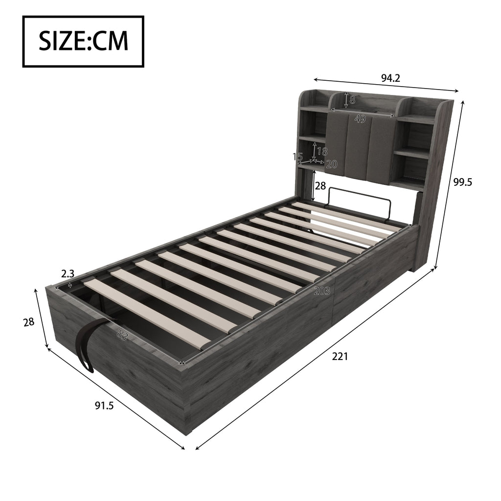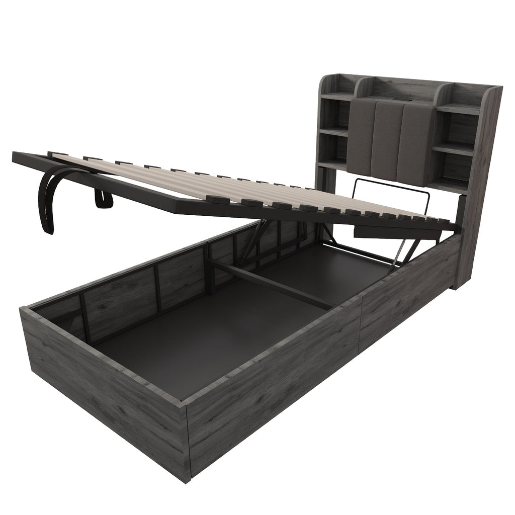 Wooden Bed, 90x200 cm Hydraulic with Storage & USB/Type-C, Grey