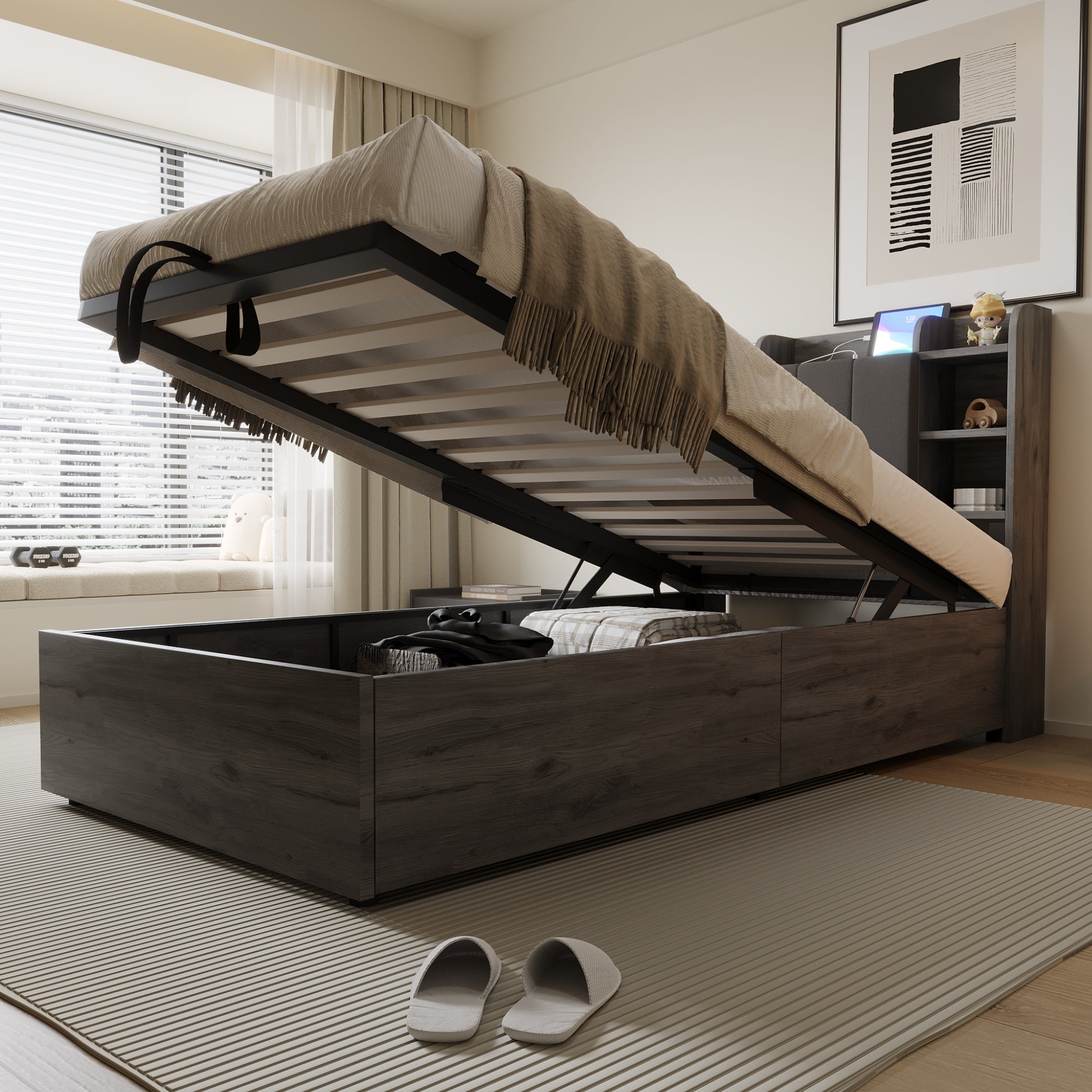 This single bed with a hydraulic bed frame offers versatile storage solutions. It features several small compartments and a large hidden storage space within the headboard, perfect for organizing accessories, electronics, small toys, and more. Additionally, the ample space under the bed maximizes bedroom utility by providing room for clothes, bedding, and other everyday items.