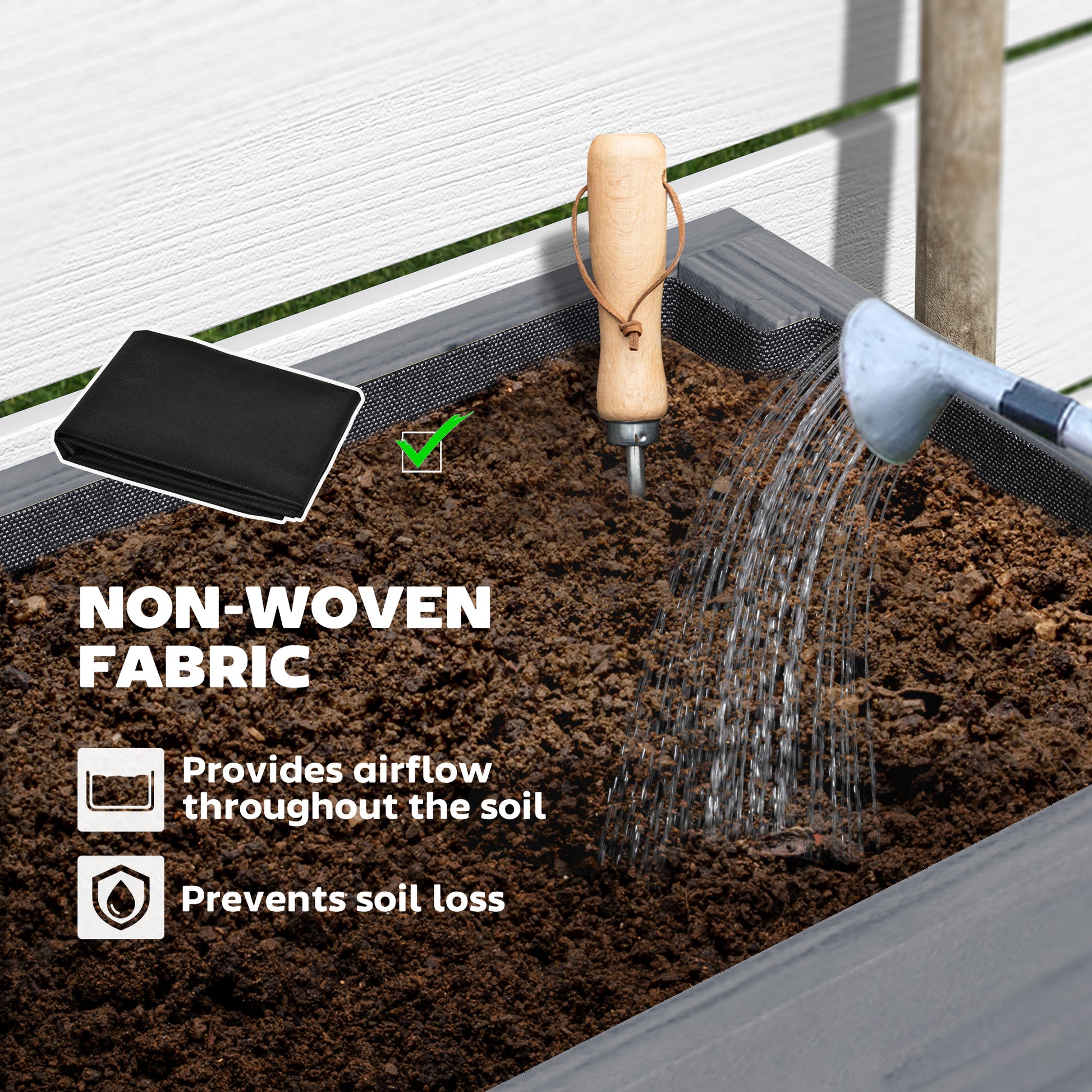 A fabric lining holds all soil inside the raised wooden planter, preventing loss and helping to extend the lifespan of the wood by separating it from the soil.
