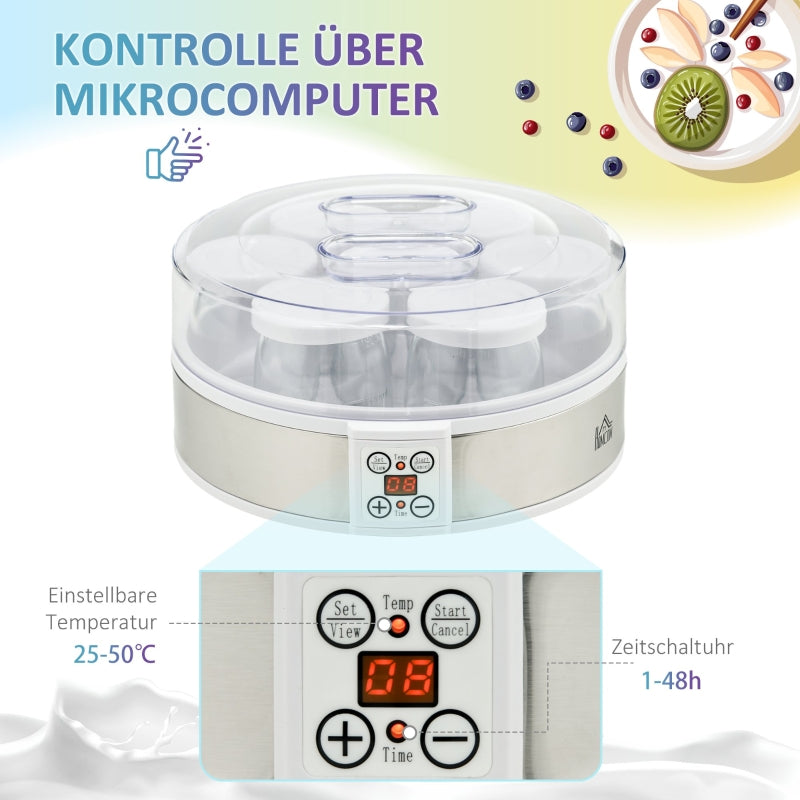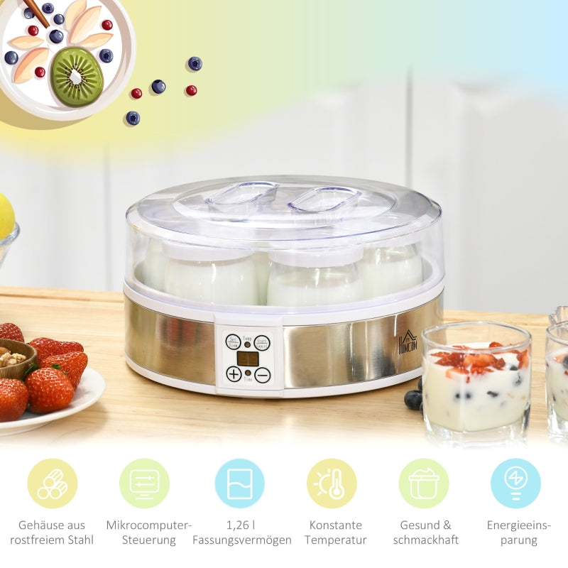 Yogurt Maker Machine, 7 Glass Jars, Stainless Steel, Silver and White
